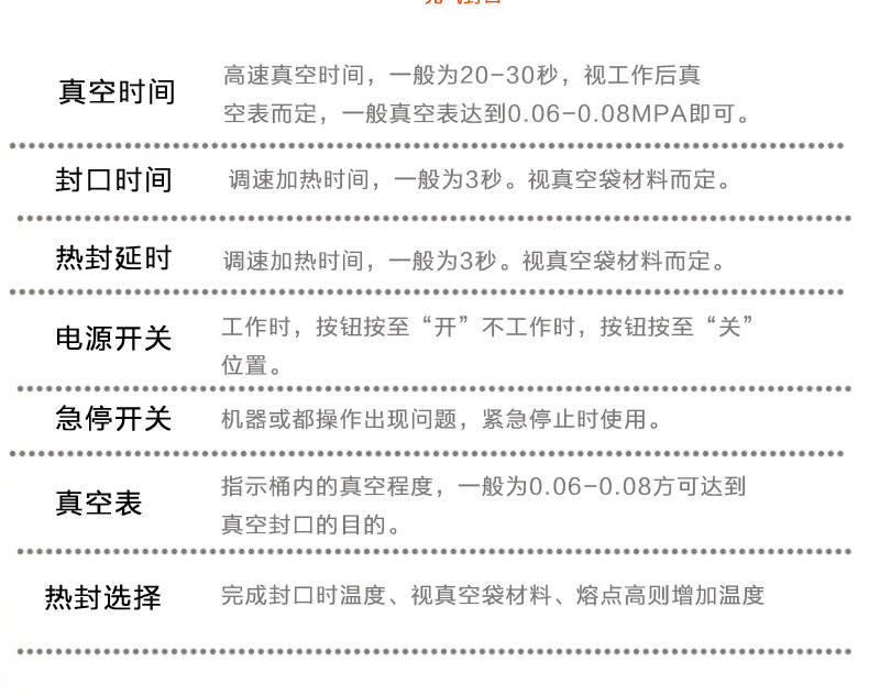 1、接通電源:開啟電源開關,即電源指示燈亮,設定抽氣時間、熱封時間、熱封溫度。