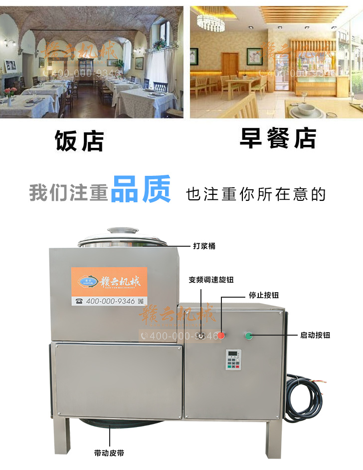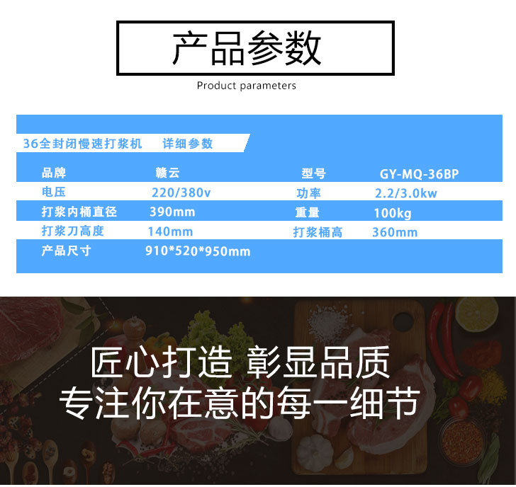 贛云牌36型全封閉式慢速變頻肉丸打漿機選優質不銹鋼,在全不銹鋼慢速肉丸打漿機基礎上將整機外殼用不銹鋼板材封裝,更好的保護電動機,通過小皮帶輪帶動大皮帶輪減速,慢速拍打肉漿。