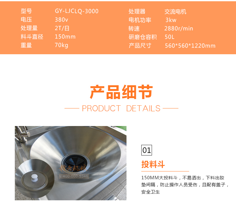 商用垃圾處理器,雙層五級研磨技術,研磨顆粒大小5毫米,食物垃圾連續處理,無懼堵塞可處理的垃圾:殘羹剩飯、肉魚骨刺、蔬菜瓜果、蛋殼、茶葉渣、玉米棒芯、牲畜骨頭、硬質貝克等食物垃圾