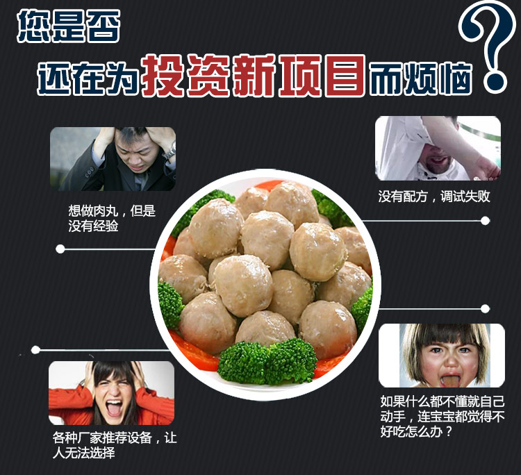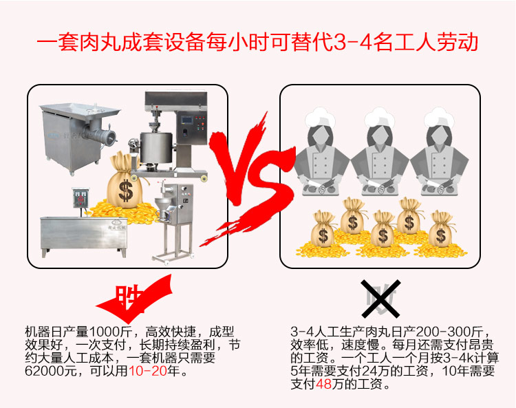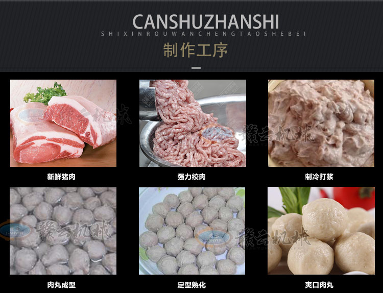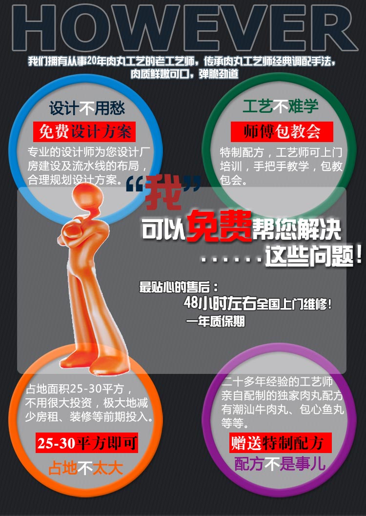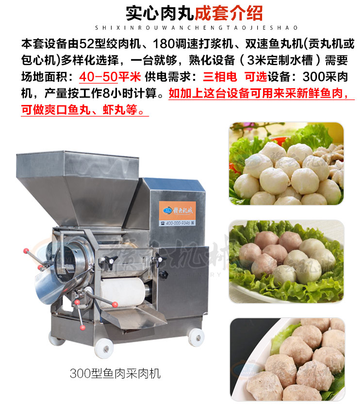 本套設備由52型絞肉機、180調速打漿機、雙速魚丸機(貢丸機或包心機)多樣化選擇,一臺就夠,熟化設備(3米定制水槽)需要產地面積:40-50平米供電需要:三相電可選設備:300采肉機,產量按工作8小時計算。如加上這臺設備可用來采新鮮魚肉,可做爽口魚丸,蝦丸等。