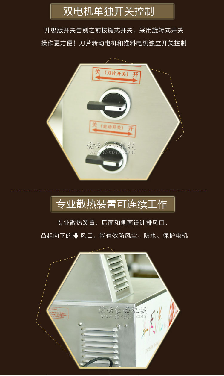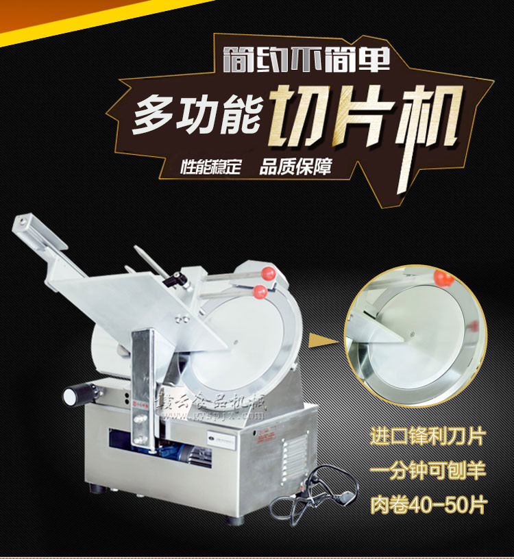 贛云牌全自動羊肉切片機采用加硬不銹鋼刀片,有效的保證了切割效率,切片厚薄可調0-15mm,可切零度以下凍肉,是凍羊肉、牛肉、豬肉切片,切卷利器;該機采用雙電機分別控制切肉刀轉動和推料走動,切肉刀轉動控制開關關閉狀態會自動切斷推料走動電機電源,已確保操作人員的人身安全。整機設計科學合理、美觀大方、省時省力、安全高效,是火鍋店、酒店、西餐等加工羊肉卷信賴的設備。