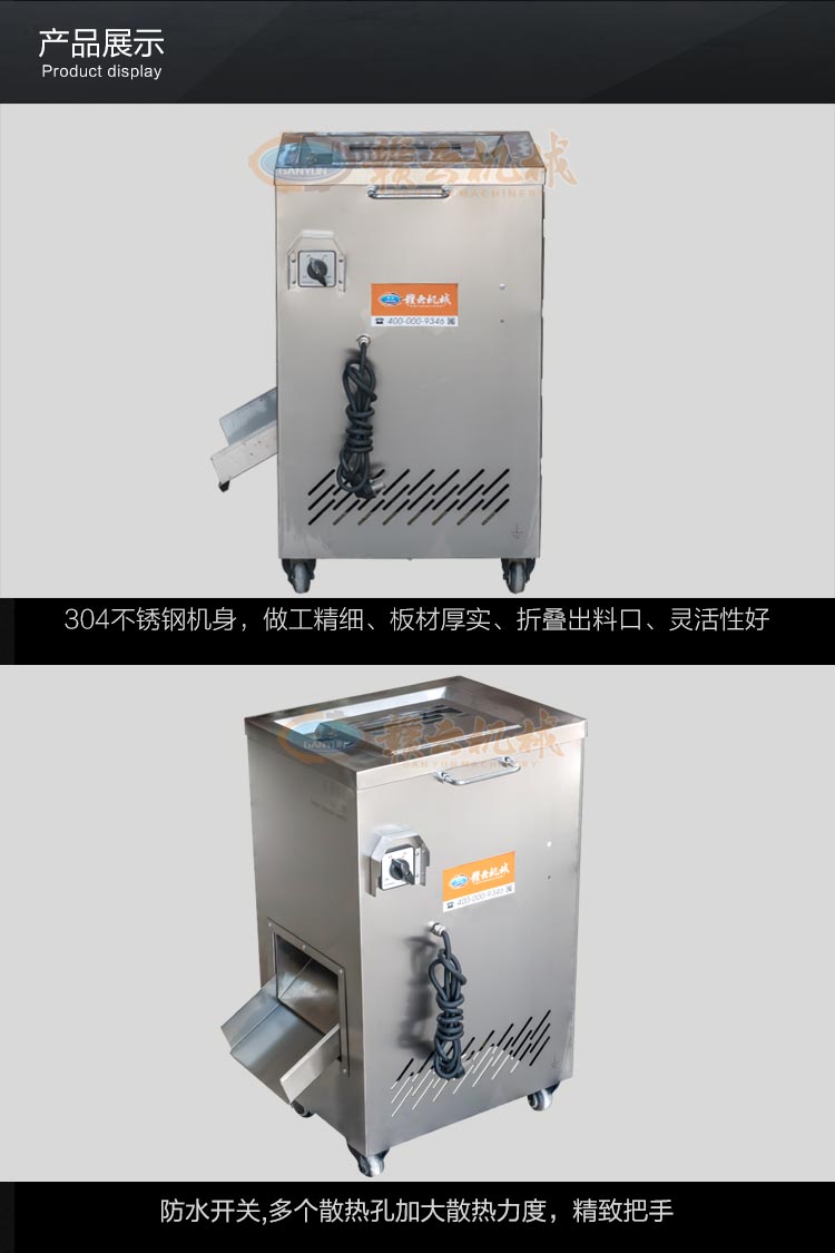不銹鋼切肉機不銹鋼切肉機,進料口鏤空設計,方便看到下料進度,進料口防護蓋板材加厚,堅固耐用。鋒利刀片,刀間距3.5mm,切切肉片、肉絲、肉粒。防水旋鈕開關。折疊出料口,節省空間,推回可防止料斗刮壞。側板拆卸可看到電機。304不銹鋼機身,兩個萬向輪,兩個非萬向輪,容易固定,省心。