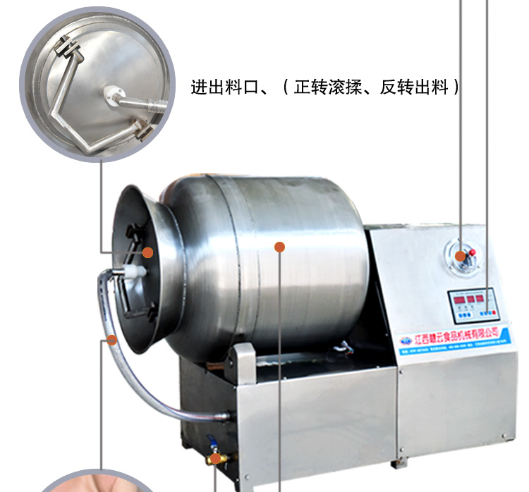 滾揉機可以使肉均勻的吸收腌漬,可以提高肉的結著力及產品的彈性;可以提高產品的口感及斷面效果;可以增強保水性,增加出品率;可以改善產品的內部結構,節能高效。整機采用不銹鋼制造,結構緊湊,滾筒兩端均采用旋壓式封帽結構,最大的增加滾筒內的摔打空間,使滾揉產品的效果均勻,噪音小,性能可靠,操作簡便,使用效率更高。