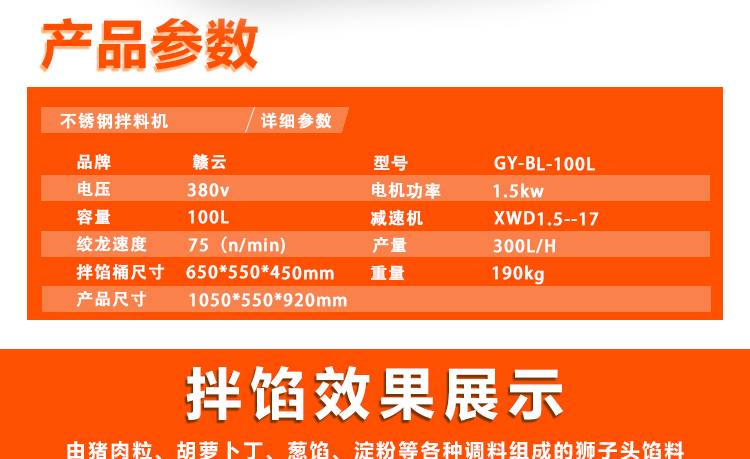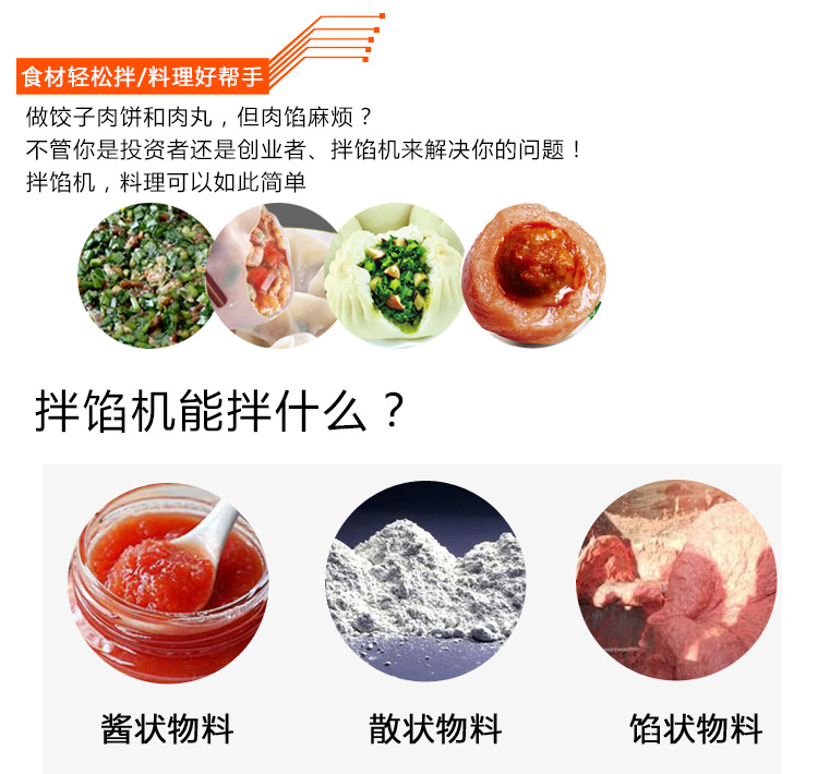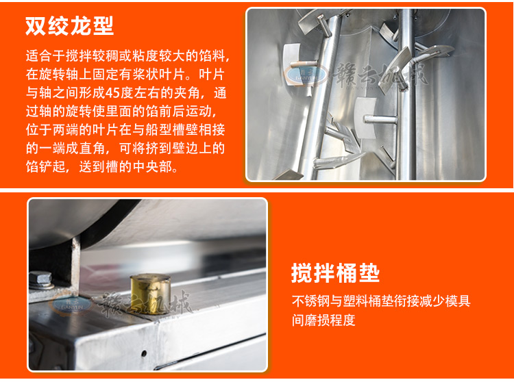 本機采用304不銹鋼材質設計,符合食品衛生加工需求,絞龍型攪拌鋼軸可向內向外雙向攪拌旋轉運動,由倒順開關控制攪拌方向,適合粘稠度較大物料的攪拌,攪拌過程還對肉質起嫩化效果,是肉餡、肉醬、菜餡等攪拌的上好設備。