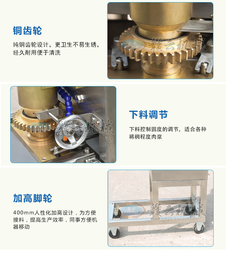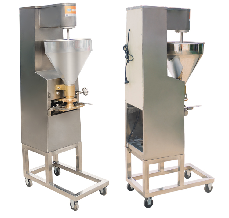 本款實心肉丸成型機是在120型實心肉丸成型機的基礎上加高設計,是配合我司設計的雙加熱水槽而設計,隨機配15、20、25MM三套成型模具,可做三種規格丸子,采用絞龍推料擠壓,切刀快速切割成型原理設計,每分鐘可成型約260個肉圓,圓度可調,是實心肉丸、魚丸、蝦丸、蟹丸、雞肉丸、素丸子等加工成型利器。