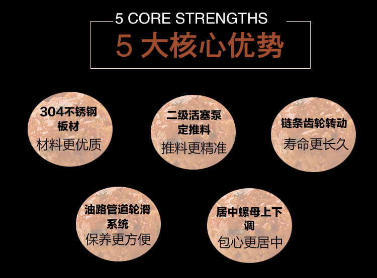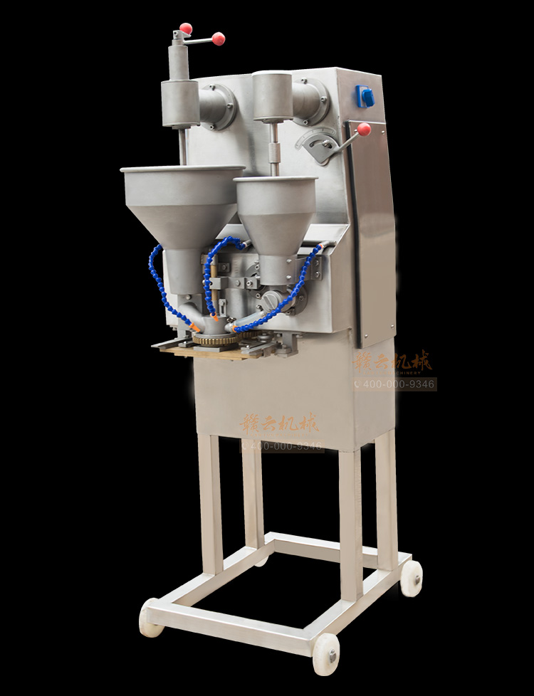 第三代包心肉丸機是在贛云二代包心肉丸機的基礎上,對二代包心機的成型切割部位進行優化提速處理,達到每分鐘200粒的成型速度是二代包心機的兩倍,且推料控制方式還是選用一級絞龍推料和二次泵定量輸送相結合的原理,餡料控制改塑料螺蓋為不銹鋼抗氧化特殊處理螺蓋,餡斗新增絞龍擋板,可有效防止肉餡余留餡斗,更易肉餡的向下擠壓輸送作用,成型旋轉齒輪上新增潤滑滴管,彌補了二代包心機成型區域局部潤滑切刀的缺陷,做出的包心包餡丸表皮光滑,個體圓且大,成型速度快,無小尾巴等優勢。綜上優勢pk二代和目前其他廠家新款式包心肉丸機,故稱之為贛云第三代包心肉丸機!