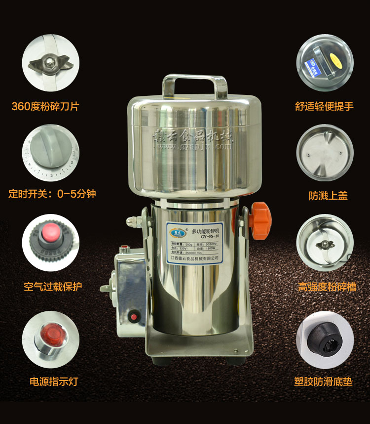 贛云系列多功能粉碎機采用純銅高速電機帶動粉碎刀片將物料快速打成粉末,可用于粉碎五谷、雜糧、田七、阿膠、白叁等,一般粉碎時間1-2分鐘即可,新款粉碎機改保險絲為空氣過載保護器,使用更安全,我廠提供的粉碎機有100克-1000克不同型號的多功能粉碎機。