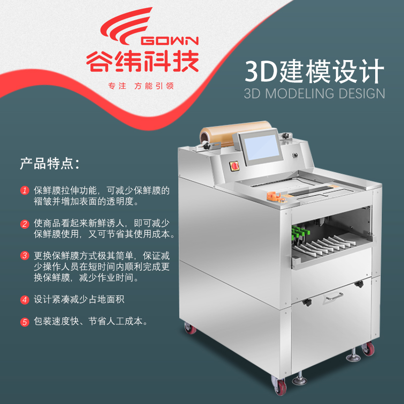 保鮮膜拉伸功能,可減少保鮮膜的褶皺并增加表面的透明度。使商品看起來新鮮誘人,即可減少保鮮膜使用,又可節省其使用成本。