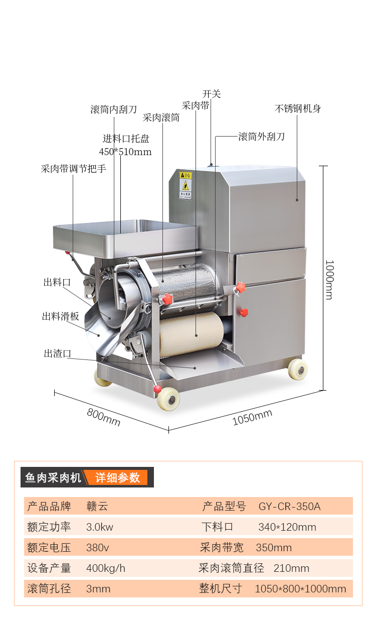 贛云牌350A型魚肉采肉機主要用于將魚刺、魚皮、魚筋和魚肉進行擠壓分離,達到提取魚肉為主要目的的前期處理設備。
