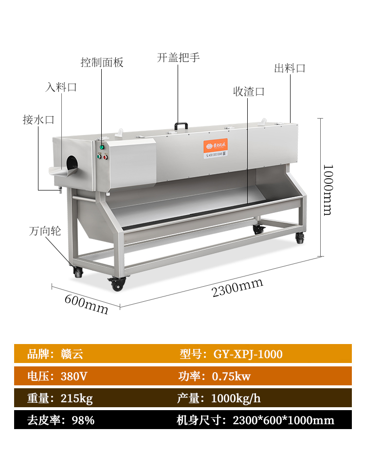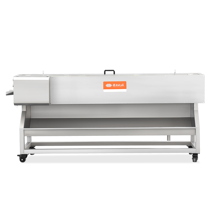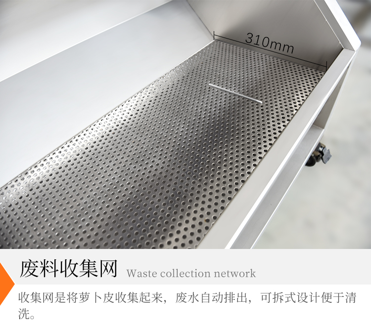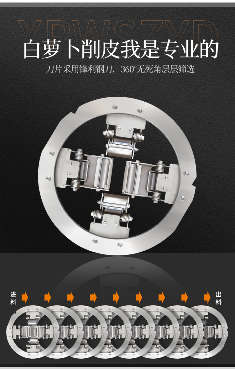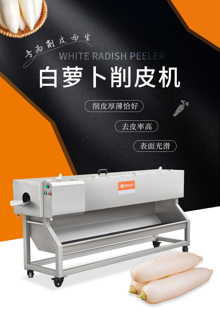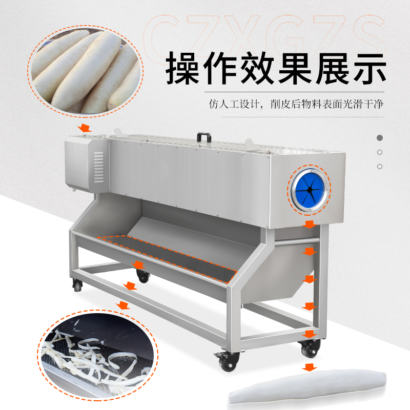 白蘿卜削皮機是贛云機械生產的一款實用型機器,針對于白蘿卜等長條型果蔬的自動去皮,多用于食品加工廠、快餐加工中心、商超、大型食堂等場所,機器使用雙向輸送橡膠彈簧設計,隨蘿卜大小自動伸縮抓料穩定不易打滑,一次性去皮,去皮成品率高,機器采用不銹鋼材質,注重食品衛生安全