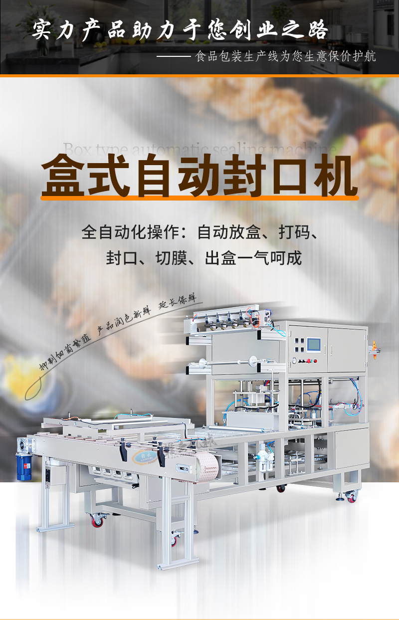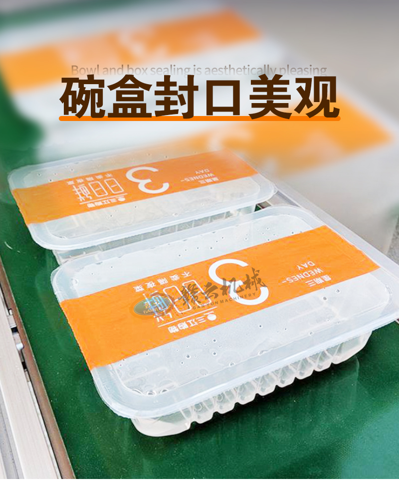 專為預制菜、快餐盒飯、鮮食、小吃等設計,實現全自動放盒、封口、切膜,支持異形包裝定制,提升鎖鮮效率與美觀度。