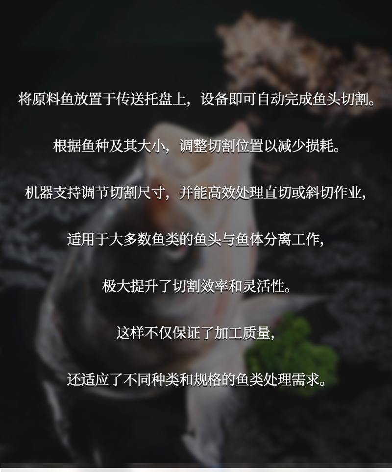 用于魚類加工中自動完成魚頭切割與分割,支持直切/斜切定制,適用于水產加工廠、大型餐飲、食品加工企業批量處理多種魚類。