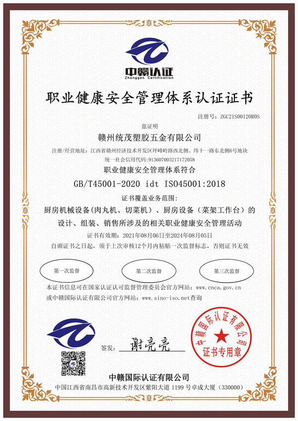 職業健康安全管理體系認證證書