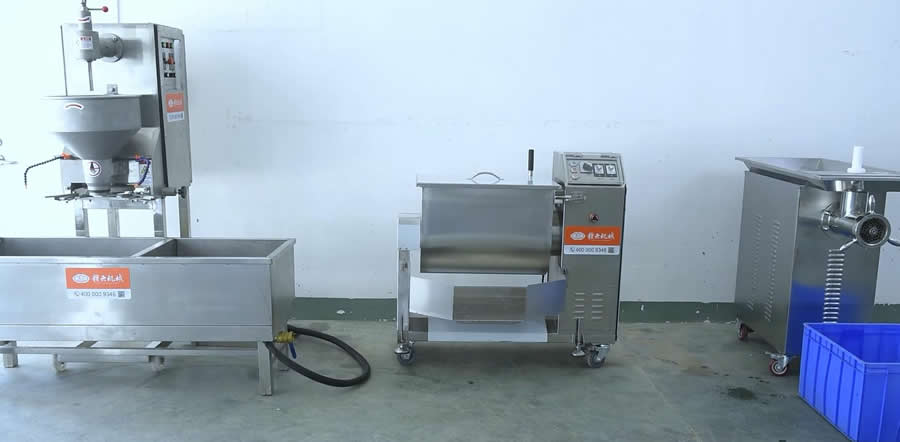 這一整套設備包含有:絞肉機、拌餡機、獅子頭肉丸成型機、智能溫控雙加熱水槽,這4臺設備組合可達到日產1噸肉丸,接下看看由贛云機械操作的機器全過程。