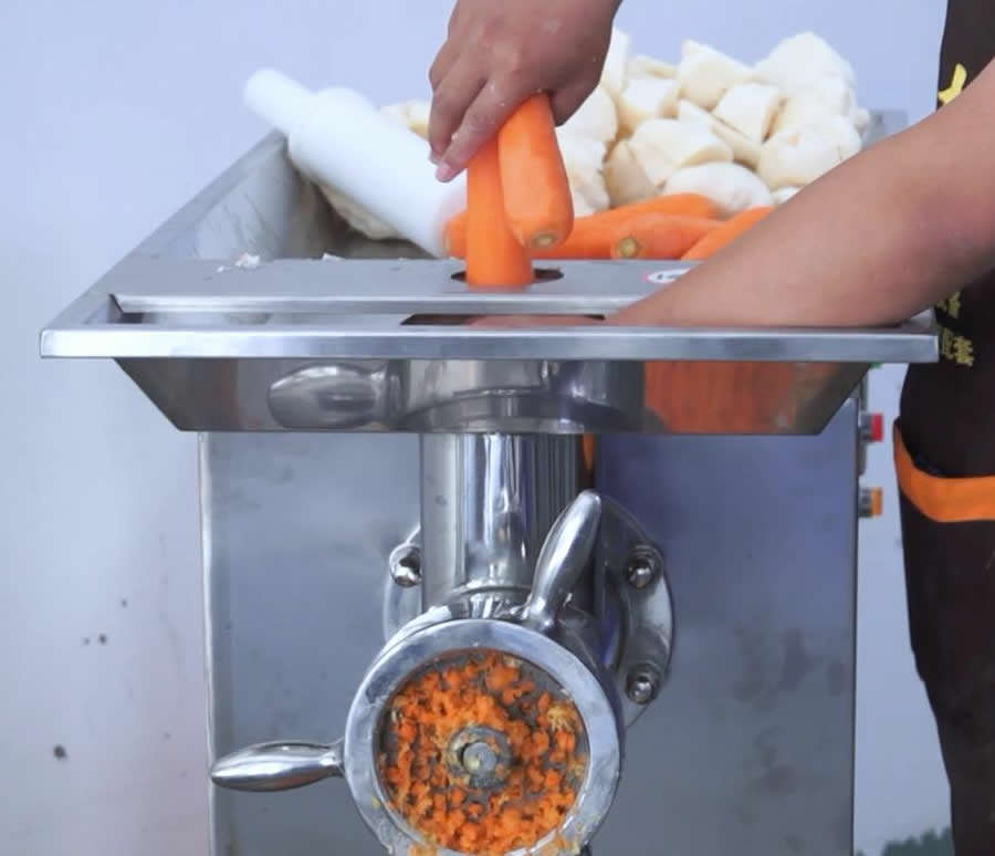 首先將所有原料準備好,原料有:鮮豬肉(比例為:瘦6肥4)、胡蘿卜、生姜、小蒜、馬蹄、淀粉、冰水等。第一步是需要將原料通過絞肉機絞碎,這一步是使用贛云42型不銹鋼絞肉機,這臺機器可以用于鮮肉、微凍肉類、蔬菜等絞碎,機器動力強勁,絞肉速度快,每小時可達600公斤。