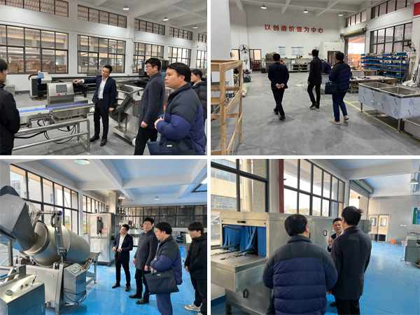 在張繼云董事長的陪同下,吳所長一行參觀了公司展廳,深入了解肉類自動化加工設備、果蔬高效處理生產線等核心產品的功能與應用場景。重點介紹了設備在降低人力成本、提升加工效率方面的創新設計。