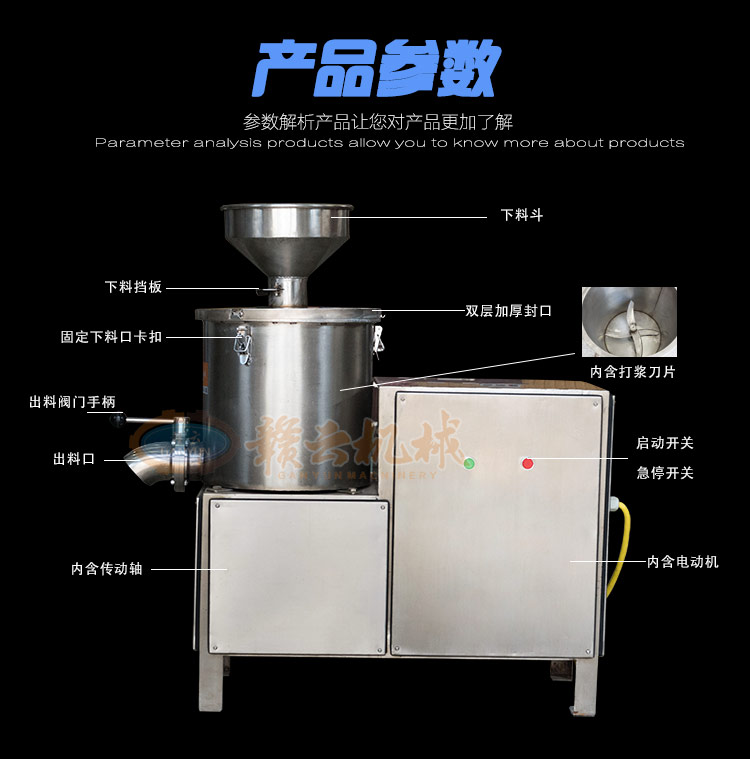 贛云牌流水式高速打漿機選用全不銹鋼材質設計制作,開機2-3分鐘即可完成打肉、配料,攪拌成漿。此款流水式高速打漿機針對流動性強肉漿的制作更方便,如稀釋肉漿的加工制作、果蔬漿,較稀的肉漿的制作,不論是從投料還是出料,贛云牌流水式高速肉丸打漿機都是更好的選擇。