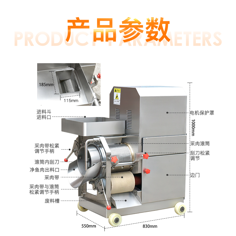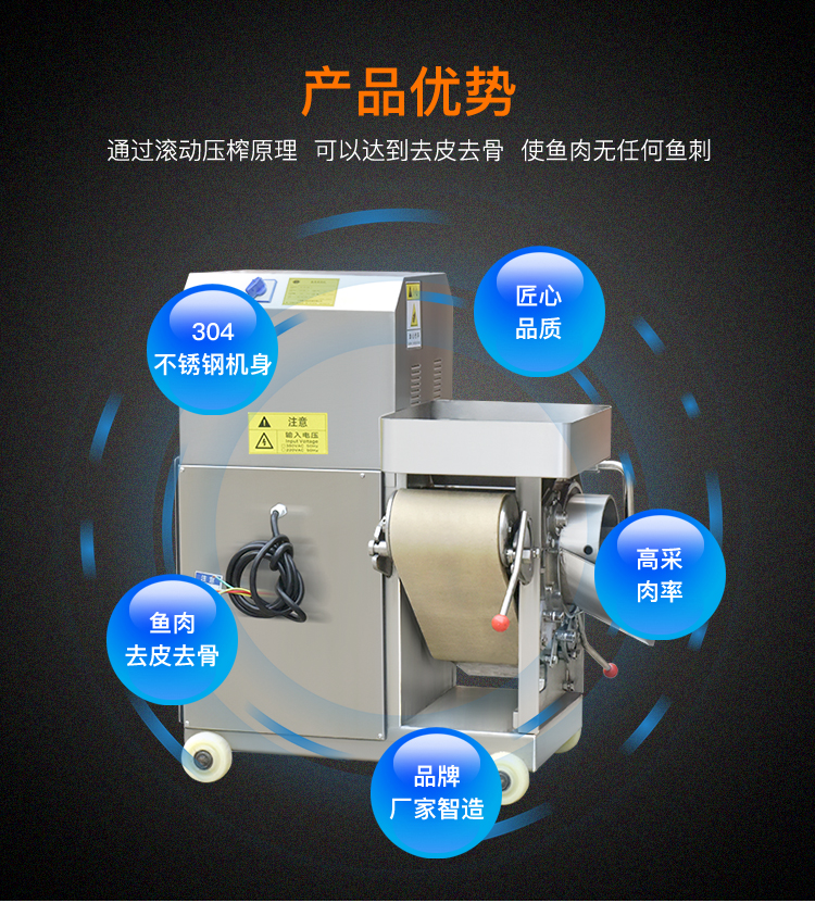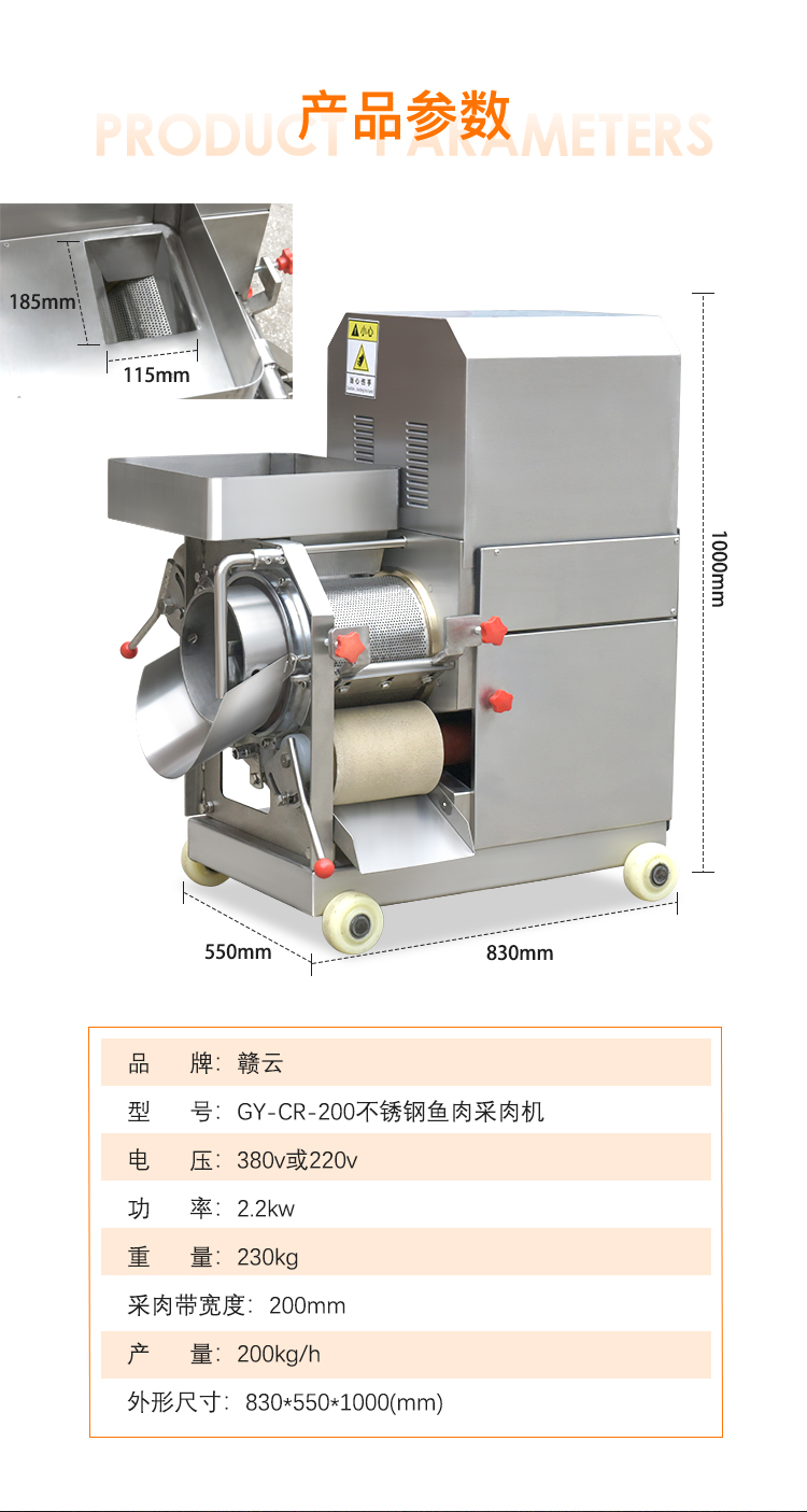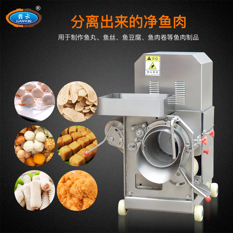 贛云系列不銹鋼200型魚肉采肉機又稱為去魚骨機,采用擠壓原理將魚肉跟魚皮和魚骨分離開來,達到采魚肉的作用,這樣分離出來的魚肉含魚骨較少,還含有少量的魚筋、魚血等雜物,一般可使用魚糜精濾機過濾一遍,可使魚肉色純,魚肉更細膩,生產高品質魚糜制品。