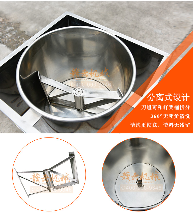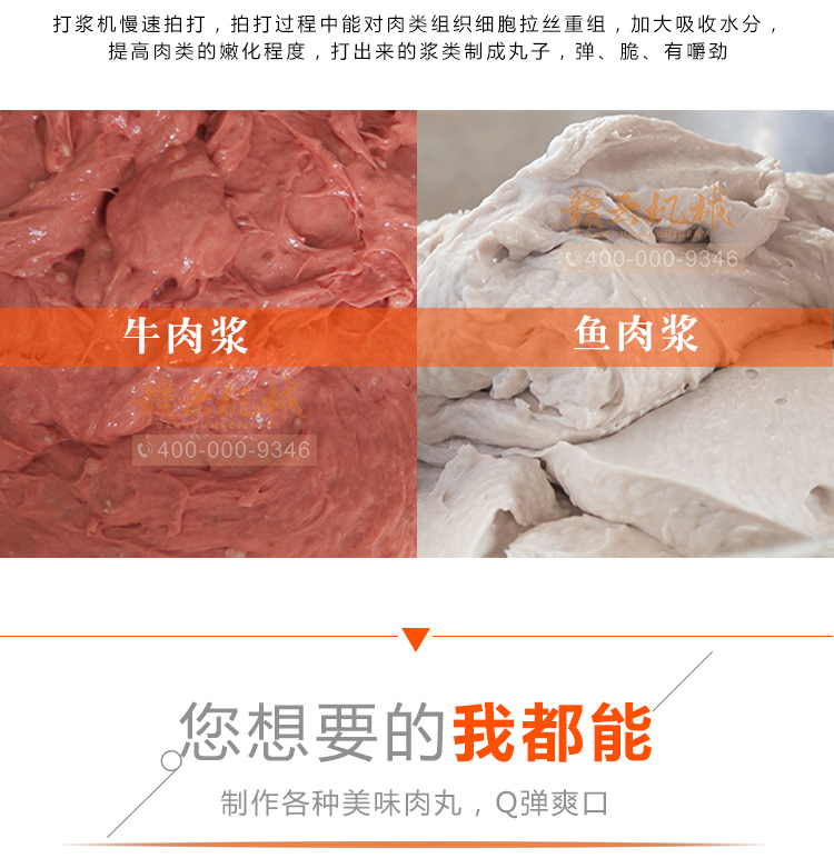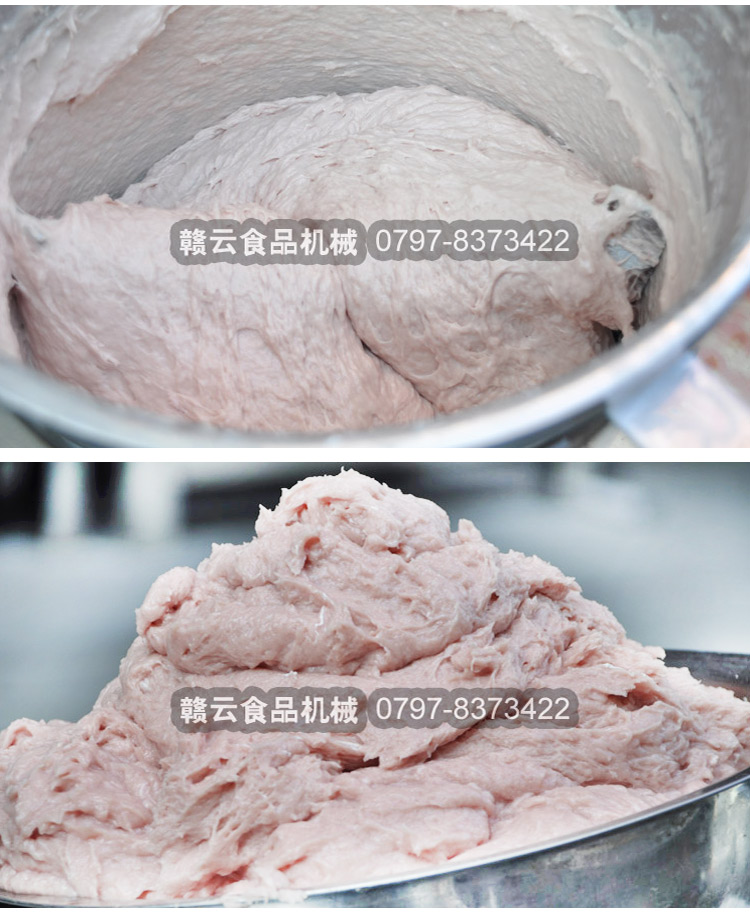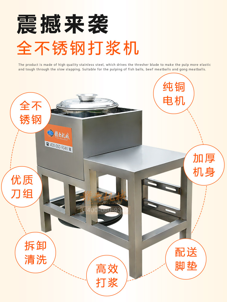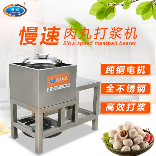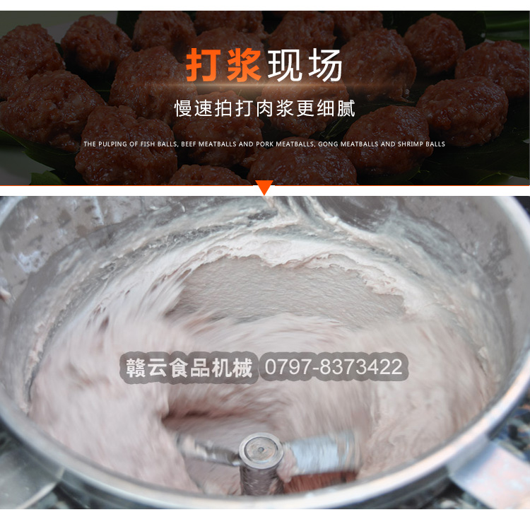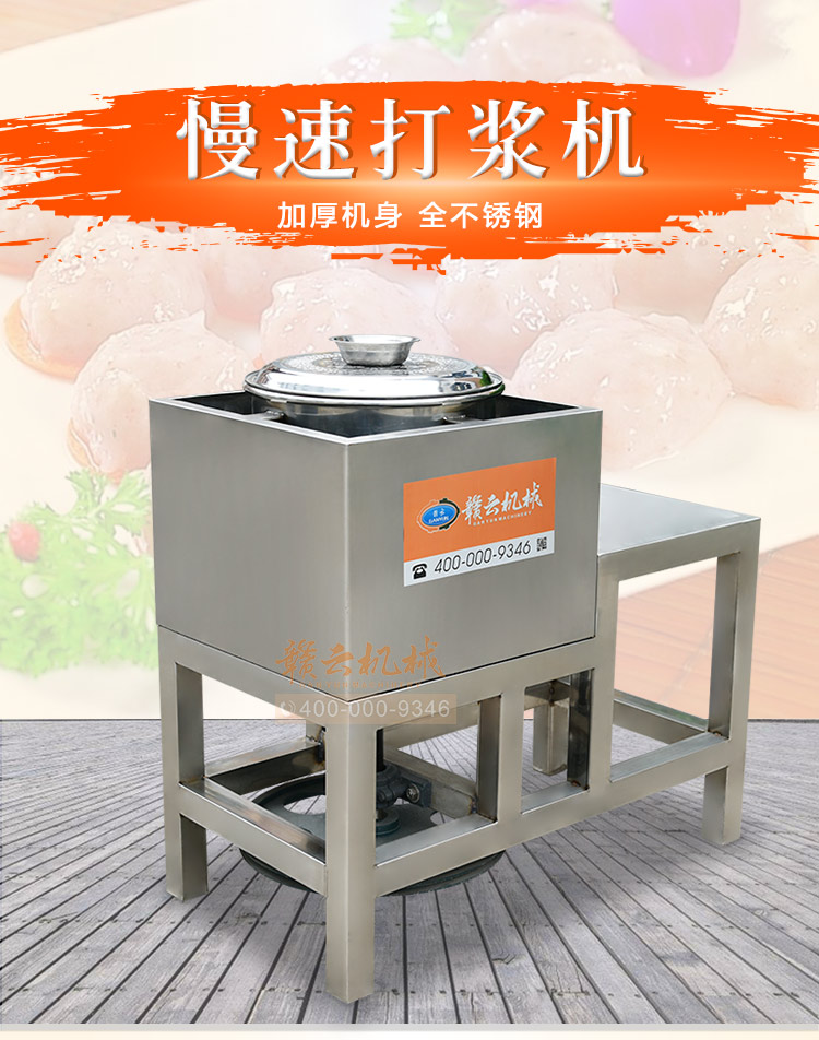 贛云牌全不銹鋼慢速魚丸、肉丸打漿機采用優質不銹鋼材質,通過大皮帶輪減速帶動打漿機刀片打漿,通過慢速拍打,使肉漿更具有彈性和韌性。適合魚丸、牛肉丸和貢丸的制漿之用。