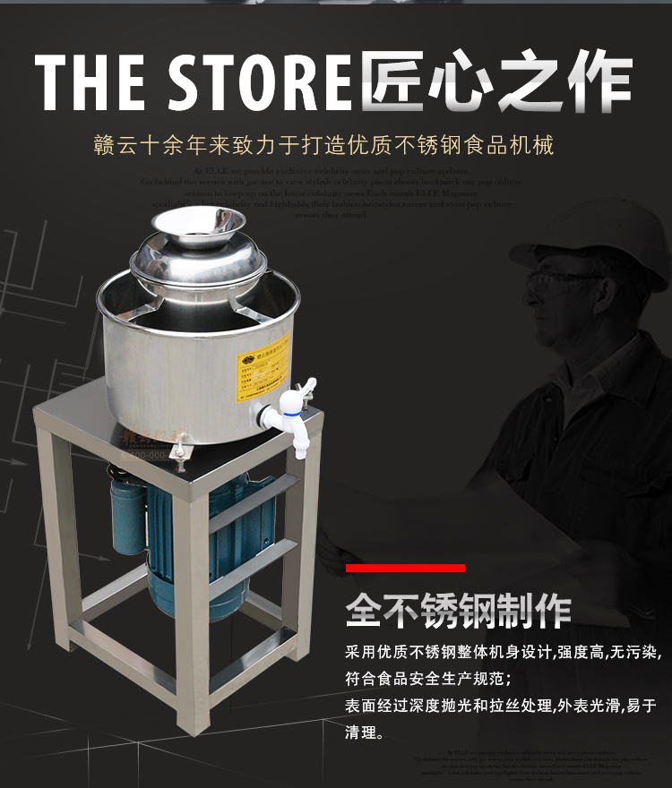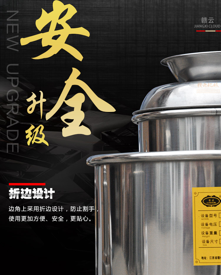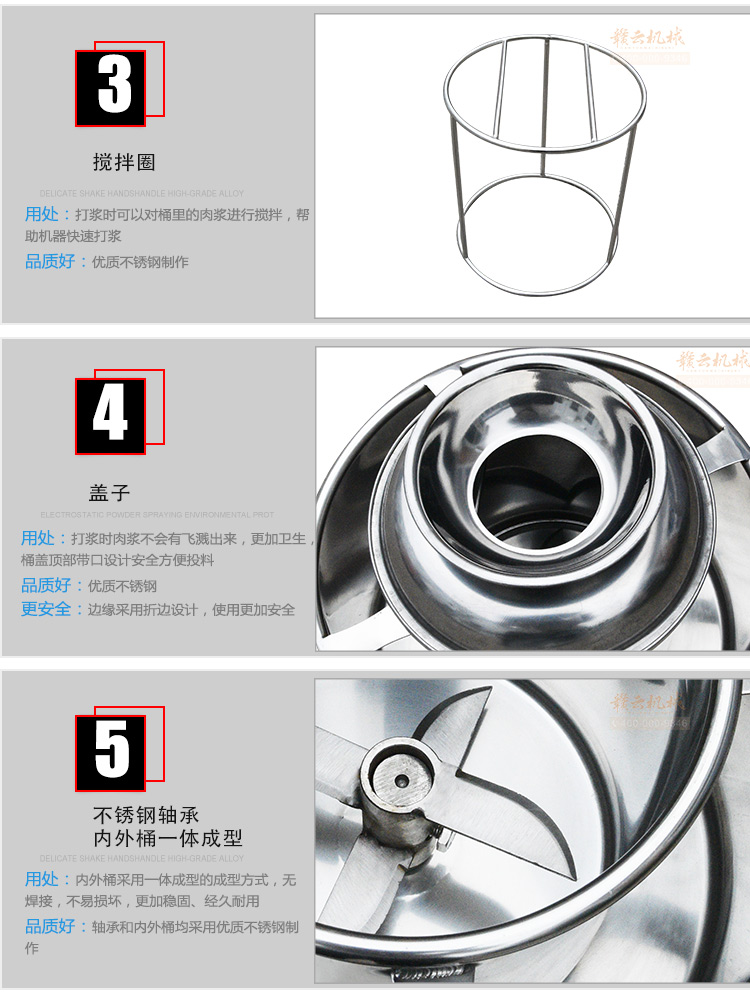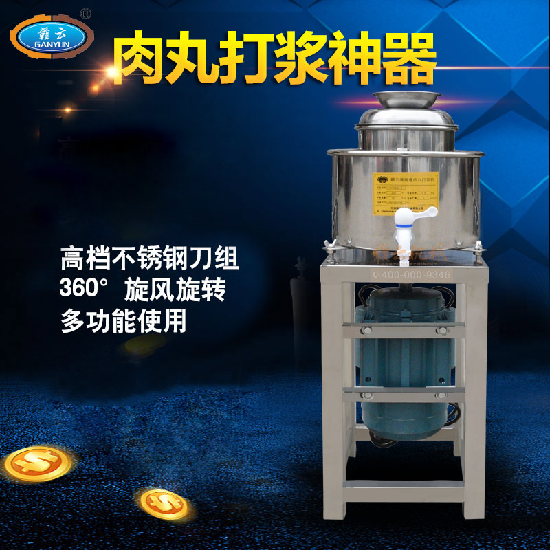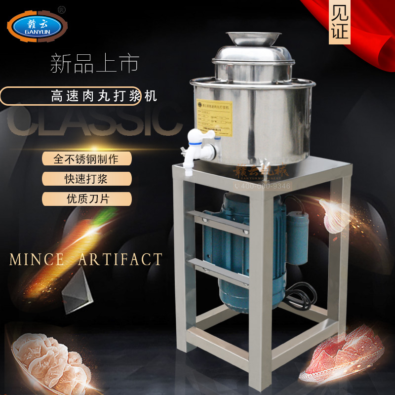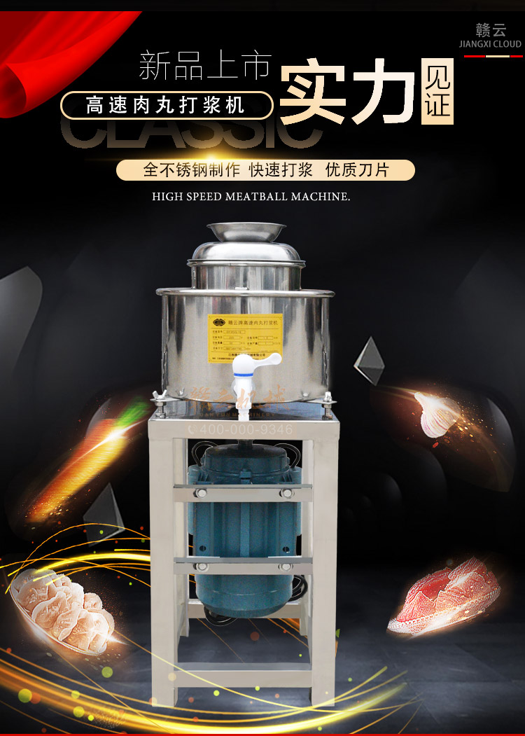 贛云牌新款全不銹鋼肉丸機,18型肉丸機采用全不銹鋼材質,在舊款全不銹鋼肉丸機的基礎上給支撐架加粗加厚,用不銹鋼蓋,打漿雙桶,刀柄刀片均采用不銹鋼材質。打漿桶裝肉量1L,一次可打肉漿1-2斤左右,采用2800r/min高速電機,故稱之為高速肉丸機。