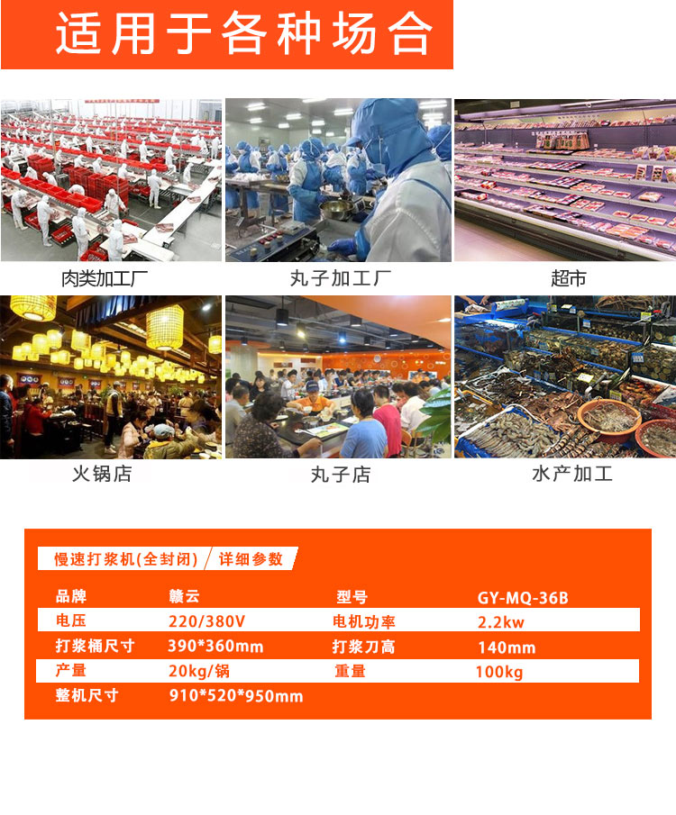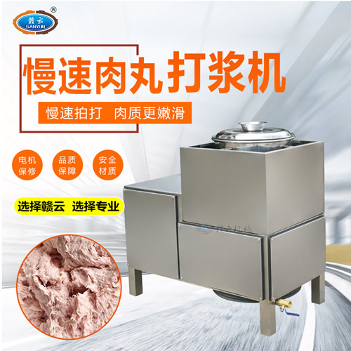 贛云牌36型全封閉式慢速肉丸打漿機選優質不銹鋼,在全不銹鋼慢速肉丸打漿機基礎上將整機外殼用不銹鋼板材封裝,更好的保護電動機,通過小皮帶輪帶動大皮帶輪減速,慢速拍打肉漿。