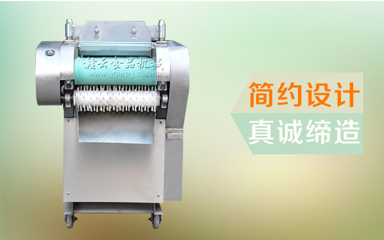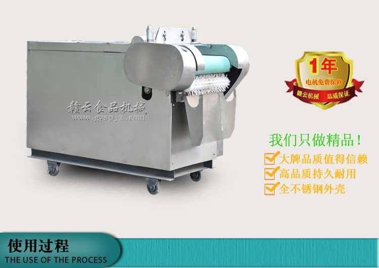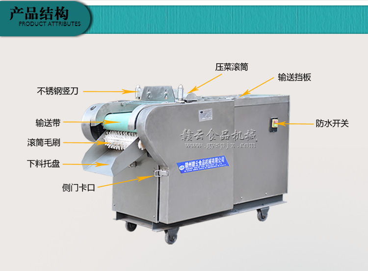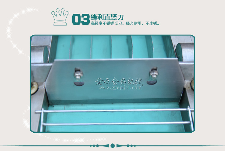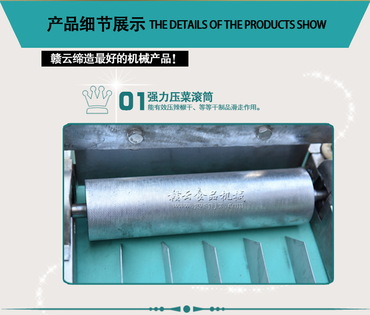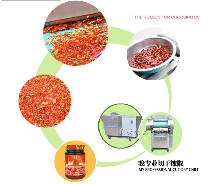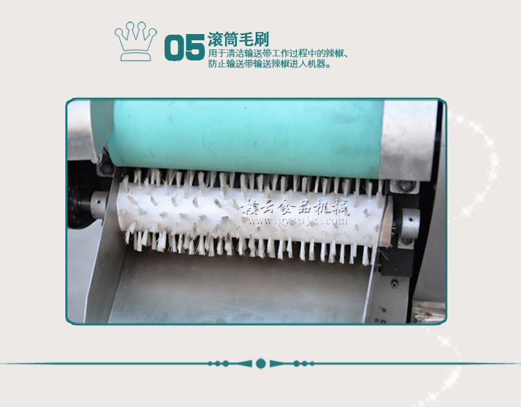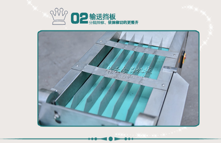 本機器是在1000型切菜機的基礎上針對干辣椒特性而改進的。改壓菜帶為滾軸壓制,為使干辣椒能比較有序的進入豎刀之中,對輸送帶入口增加隔板隔離輸送。