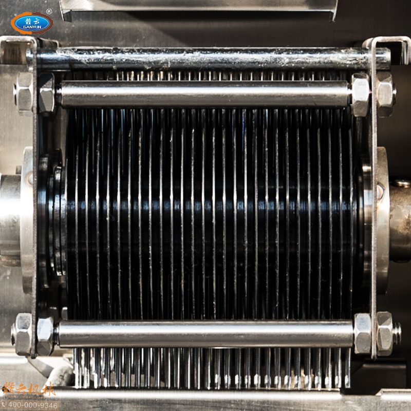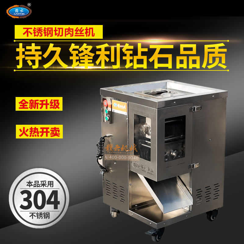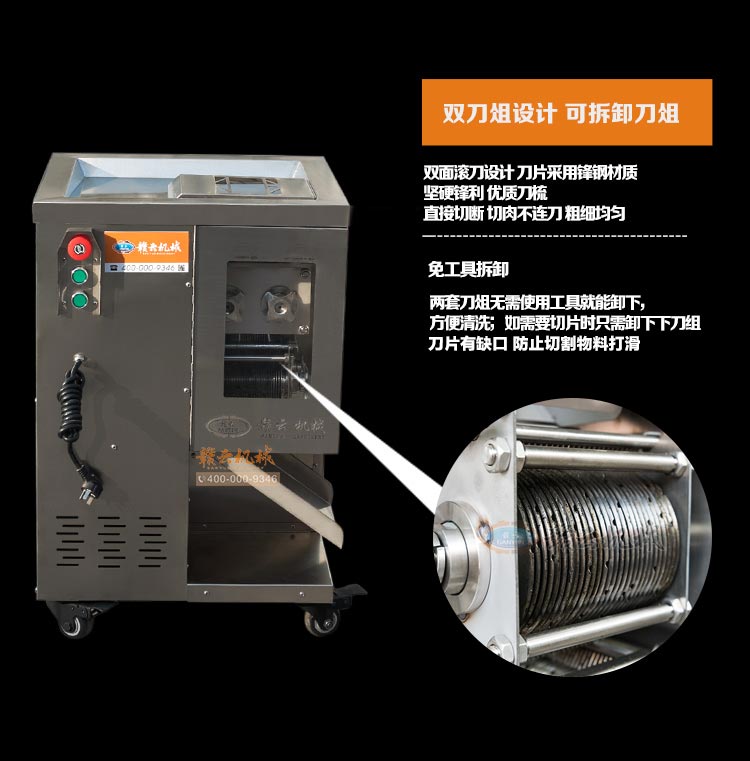 整機采用304不銹鋼板材封裝設計,板材標準1mm厚,刀片采用特質材質雙滾切刀,鋒利耐用,雙電機分別控制垂直刀組切割肉類,可一次成絲,可免工具拆卸清洗刀組,切肉速度快,力度強,切絲規格均勻