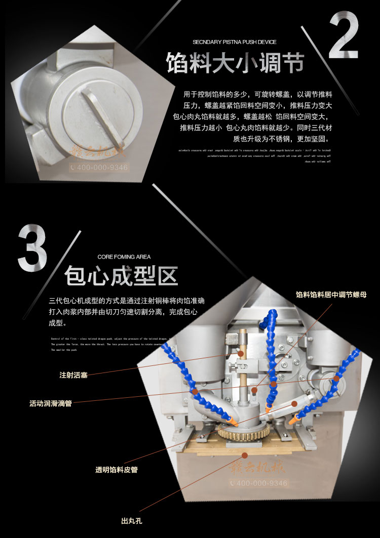 2014冬季新款包心肉丸機,第三代肉丸包心機保留了二代包心機的全部優勢外,在包心成型速度上做了本質上的突破,每分鐘成型200粒的速度是二代包心機的兩倍,機身表面接觸食物部位升級,特殊處理更耐氧化和腐蝕,由于速度上的重大突破,因而稱之為第三代包心肉丸機。