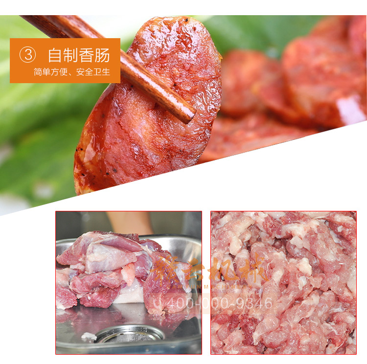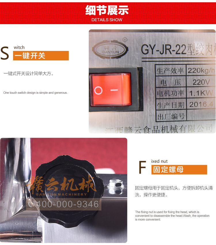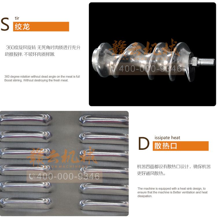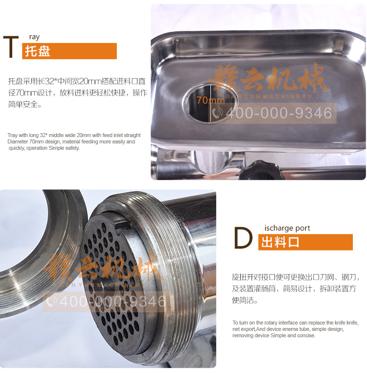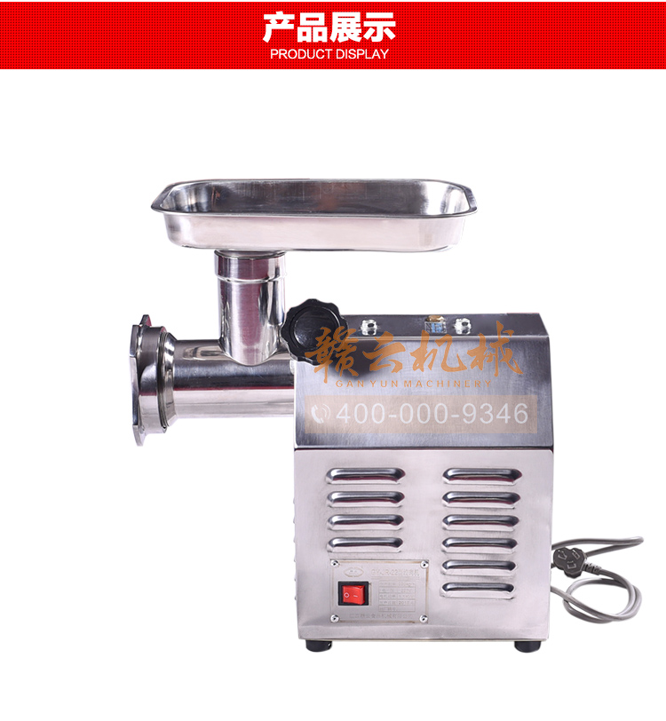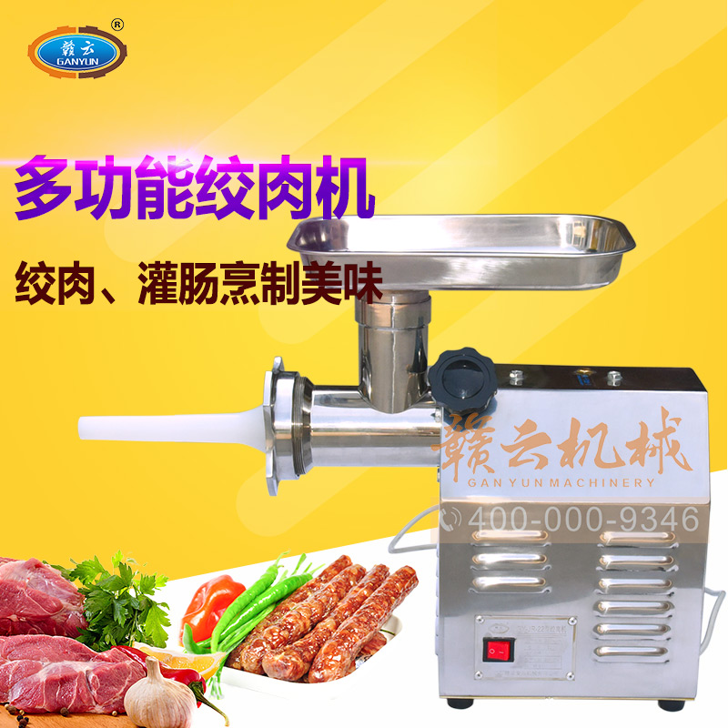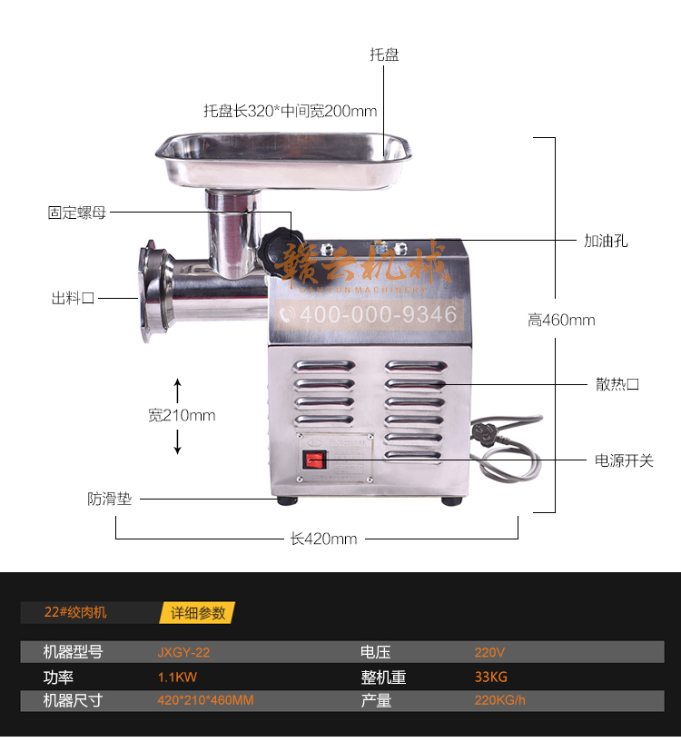 這款22型臺式不銹鋼絞肉機,采用平滑帶槽三通升級,融合不銹鋼絞龍設計,外觀設置更顯檔次,散熱性能更好,體積更大!時絞肉量220kg