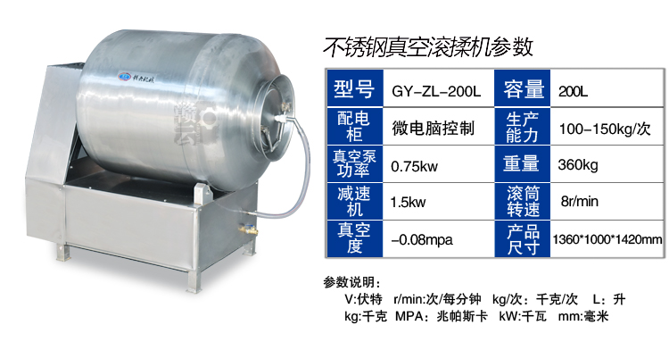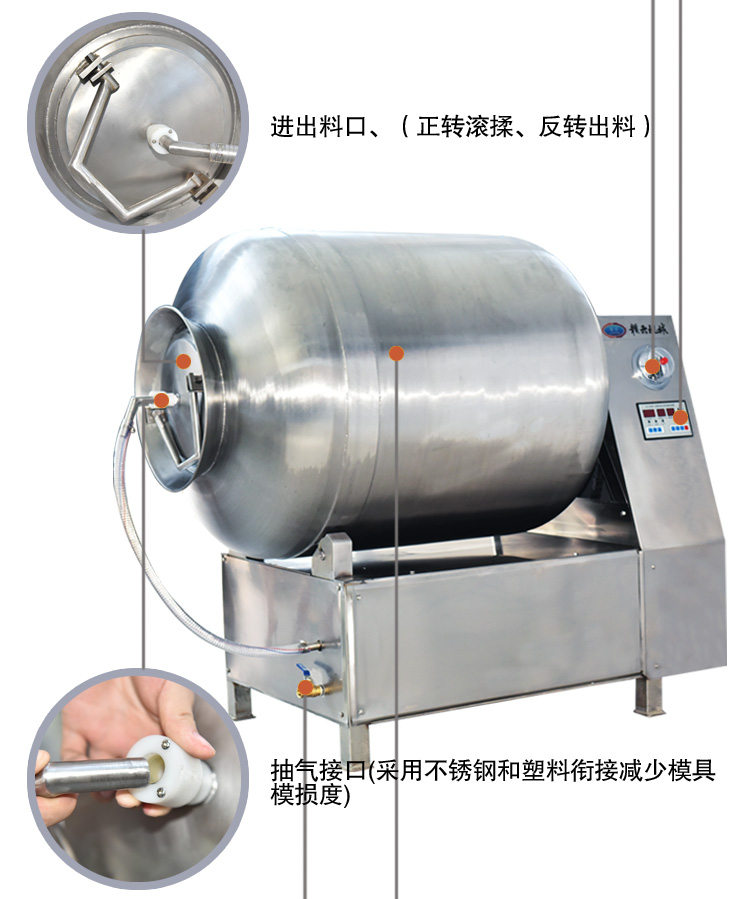 真空滾揉機可以使肉均勻的吸收腌漬,可以提高肉的結著力及產品的彈性;可以提高產品的口感及斷面效果;可以增強保水性,增加出品率;可以改善產品的內部結構,節能高效。整機采用不銹鋼制造,結構緊湊,滾筒兩端均采用旋壓式封帽結構,大大的增加滾筒內的摔打空間,使滾揉產品的效果均勻,噪音小,性能可靠,操作簡便,使用效率更高。