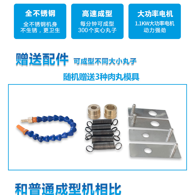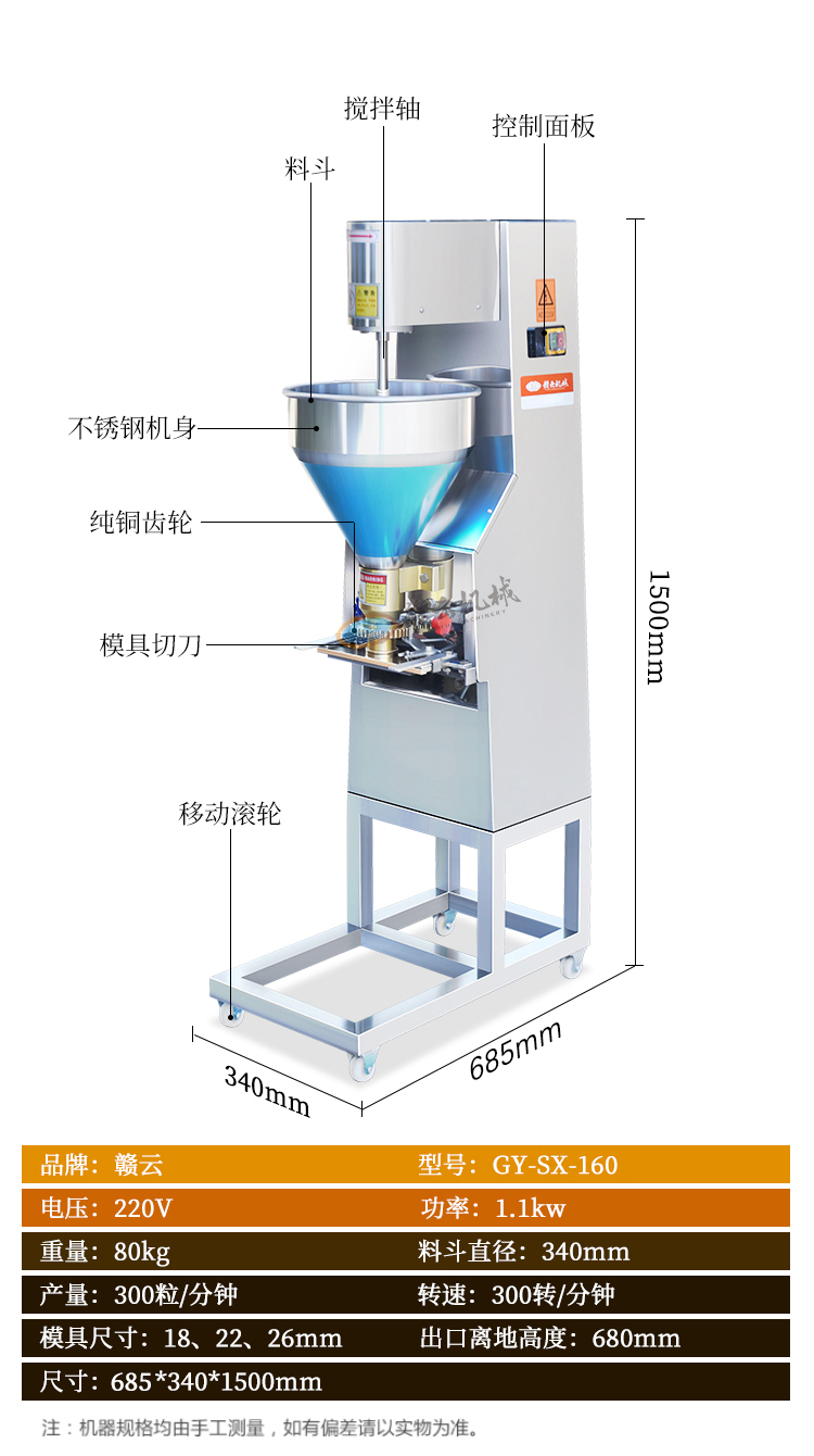本款實心肉丸成型機是在120型實心肉丸成型機的基礎上加高設計,是配合我司設計的雙加熱水槽而設計,隨機配15、20、25MM三套成型模具,可做三種規格丸子,采用絞龍推料擠壓,切刀快速切割成型原理設計,每分鐘可成型約260個肉圓,圓度可調,是實心肉丸、魚丸、蝦丸、蟹丸、雞肉丸、素丸子等加工成型利器。