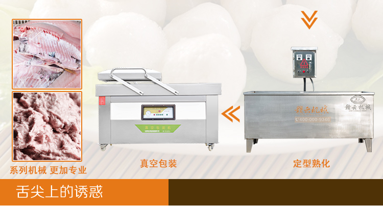 墨魚丸成套,新鮮墨魚加工成墨魚丸設備,墨魚丸機,本套設備由300不銹鋼魚肉采肉機、36型制冷慢速肉丸打漿機、180型墨魚丸貢丸成型機、1500型智能溫控雙加熱水槽和真空包裝設備組合而成,生產新鮮墨魚丸