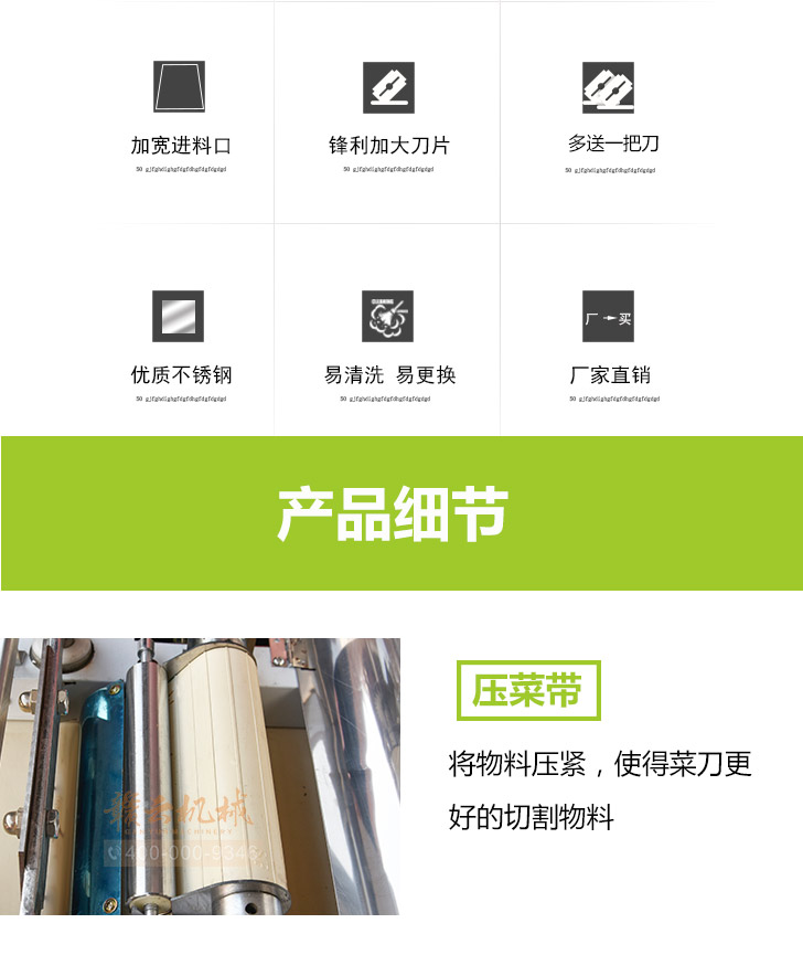 本機是根據多種樣機在實地使用中存在不足之處,反復改進設計制造,采用不銹鋼和全滾動軸承結構,具有外形美觀,成熟可靠,使用維修方便等特點。適用直蔬菜脫水、速凍、保鮮、腌漬等食品行業各類蔬菜。刀片距離可調節在0.1cm-2cm之間即切片、丁、絲厚薄在0.1cm-2cm。