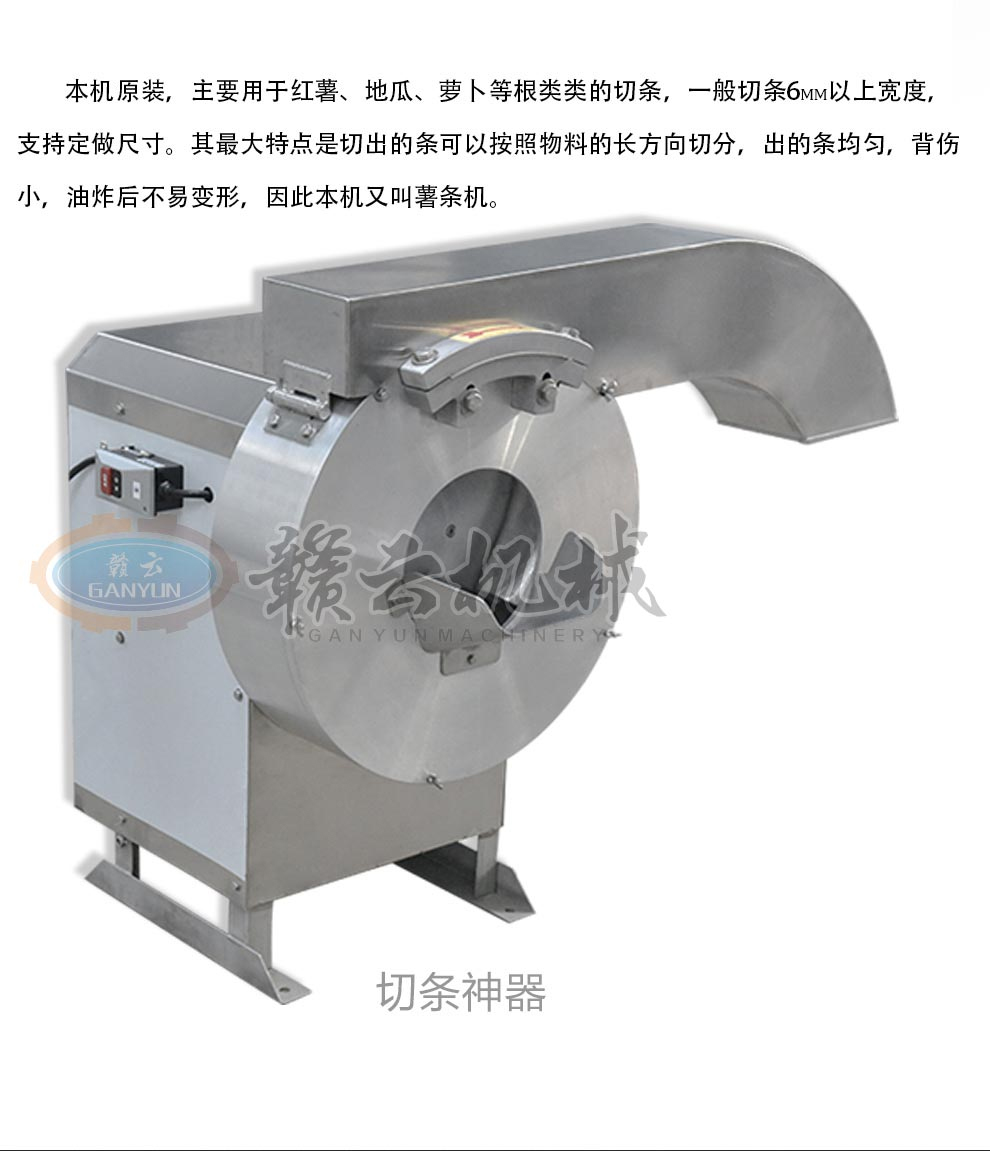 產品簡介:GY-ST-502切薯條薯片機主要用于將塊莖類的果蔬切成片狀或是條狀,刀片采用優質不銹鋼材料制造,鋒利無比,使切削出來的薯條薯片表面光滑。本機操作簡單,效率高,便于清潔。機器外部全部采用不銹鋼與鋁合金制造,所有與食物接觸的零部件均采用不銹鋼和鋁合金材料制作,主要用于薯條加工、酒店、餐飲店和相關的食品加工行業。