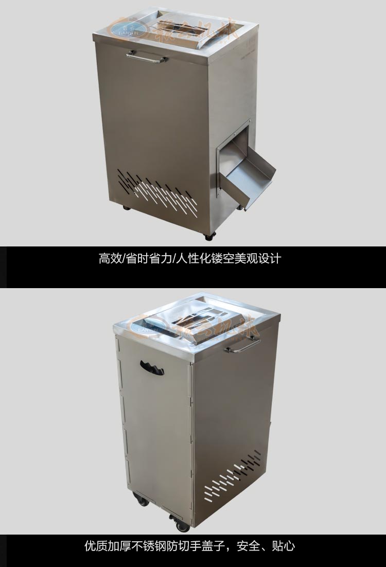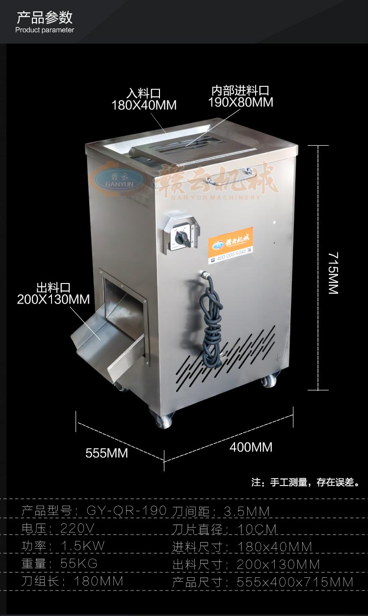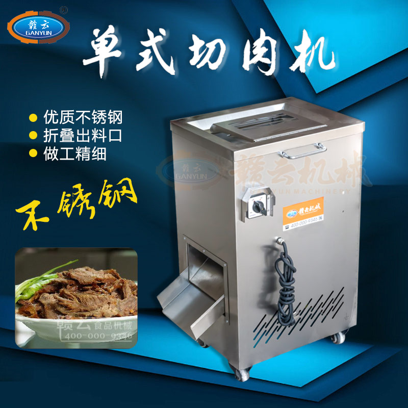 不銹鋼切肉機不銹鋼切肉機,進料口鏤空設計,方便看到下料進度,進料口防護蓋板材加厚,堅固耐用。鋒利刀片,刀間距3.5mm,切切肉片、肉絲、肉粒。防水旋鈕開關。折疊出料口,節省空間,推回可防止料斗刮壞。側板拆卸可看到電機。304不銹鋼機身,兩個萬向輪,兩個非萬向輪,容易固定,省心。