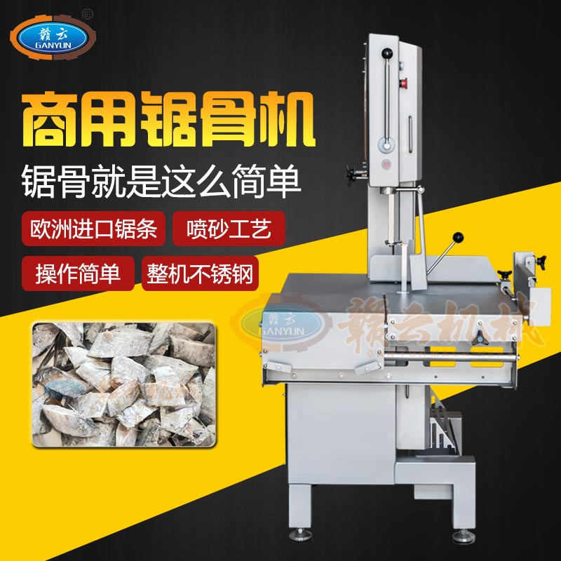 鋸骨機,鋸骨頭用什么,骨頭克星 大型立式商用鋸骨機,304不銹鋼制作,所用板材均為加厚不銹鋼,整機噴砂工藝,做工精湛。兩種推料切割方式,小塊切割和整板分割方式,可根據實際操作切換,使用過程中靈活度高,應用范圍廣。采用優質鋸條,鋸齒鋒利,耐磨韌性好,使用壽命長,輕松分解凍肉凍骨等高硬度食材,整機設計合理,鋸條與機身的拆卸簡單易懂,清洗方便徹底,在中央廚房,單位食堂、餐飲配送中心及肉聯廠等地應用廣泛。