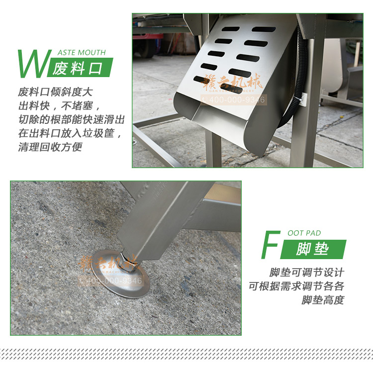 平行輸送去根機由輸送板帶動物料前行,蔬菜經過固定位置的刀盤后,蔬菜根部被切割從廢料口出來,保留的蔬菜則向前輸送。切割的長度可以調節,每顆蔬菜所切割出來的廢料都相等。去根機適合大型食品加工廠、凈菜生產線等。