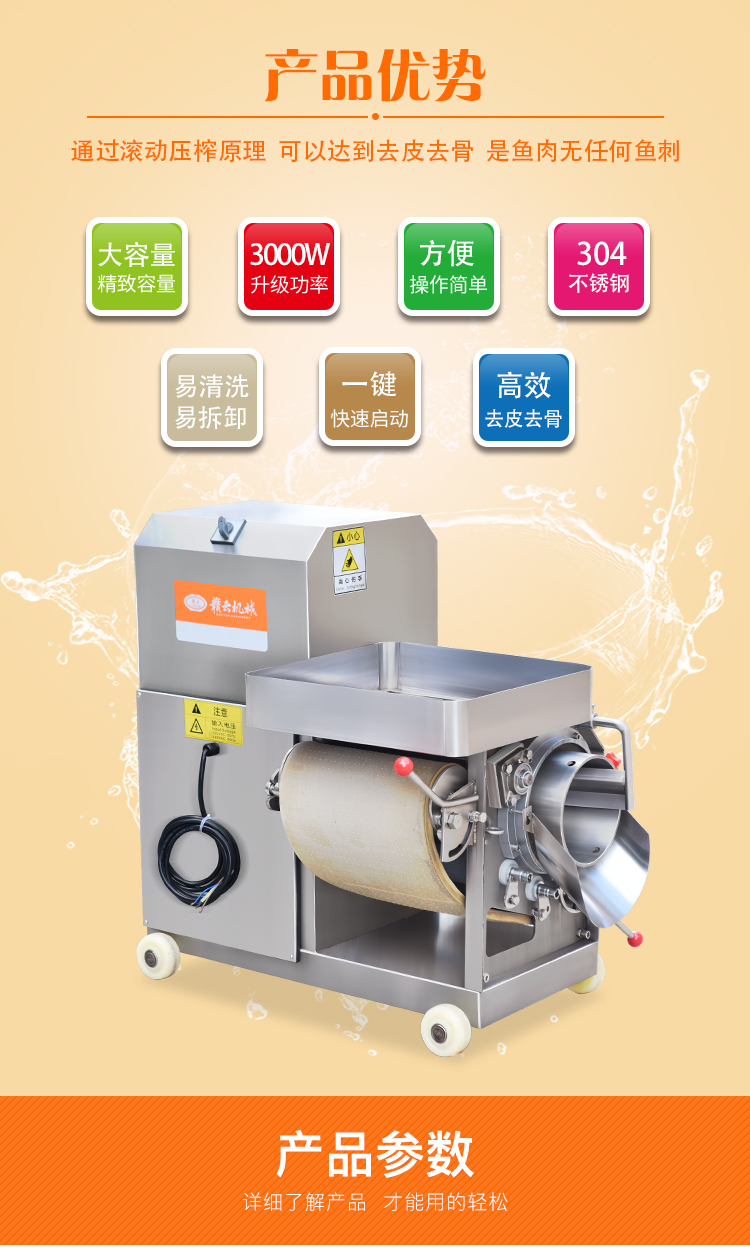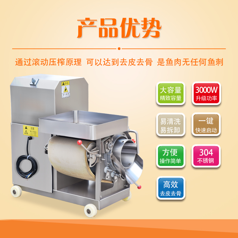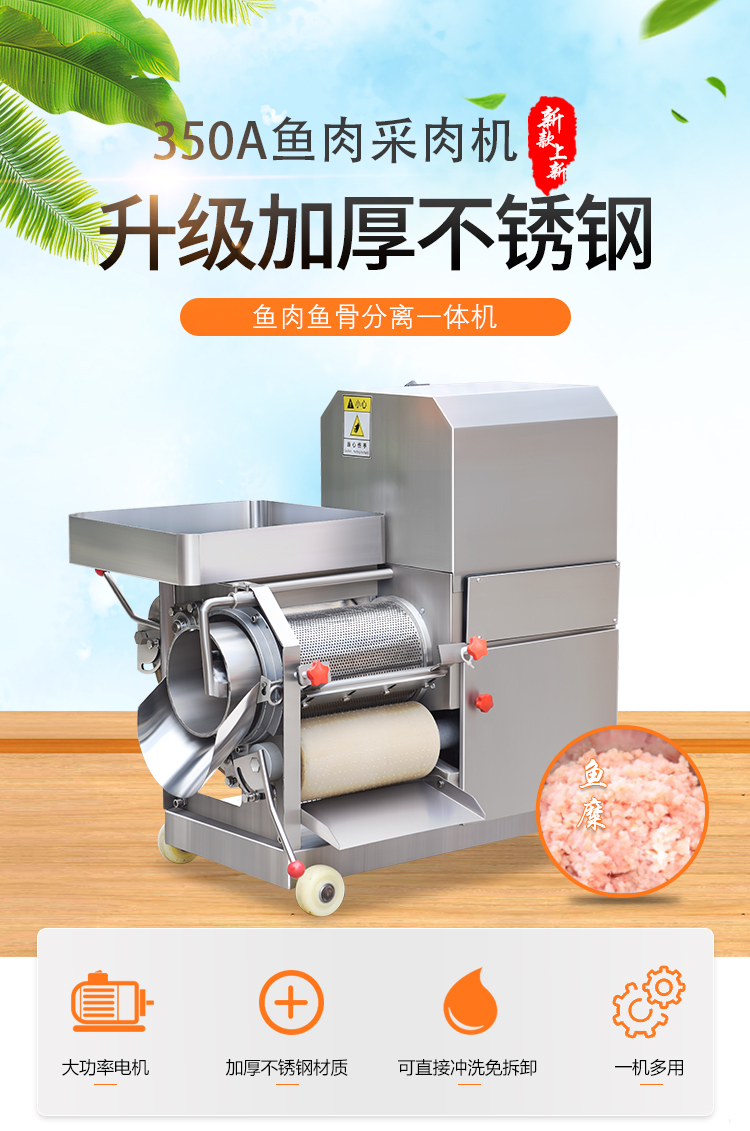 贛云牌350A型魚肉采肉機主要用于將魚刺、魚皮、魚筋和魚肉進行擠壓分離,達到提取魚肉為主要目的的前期處理設備。