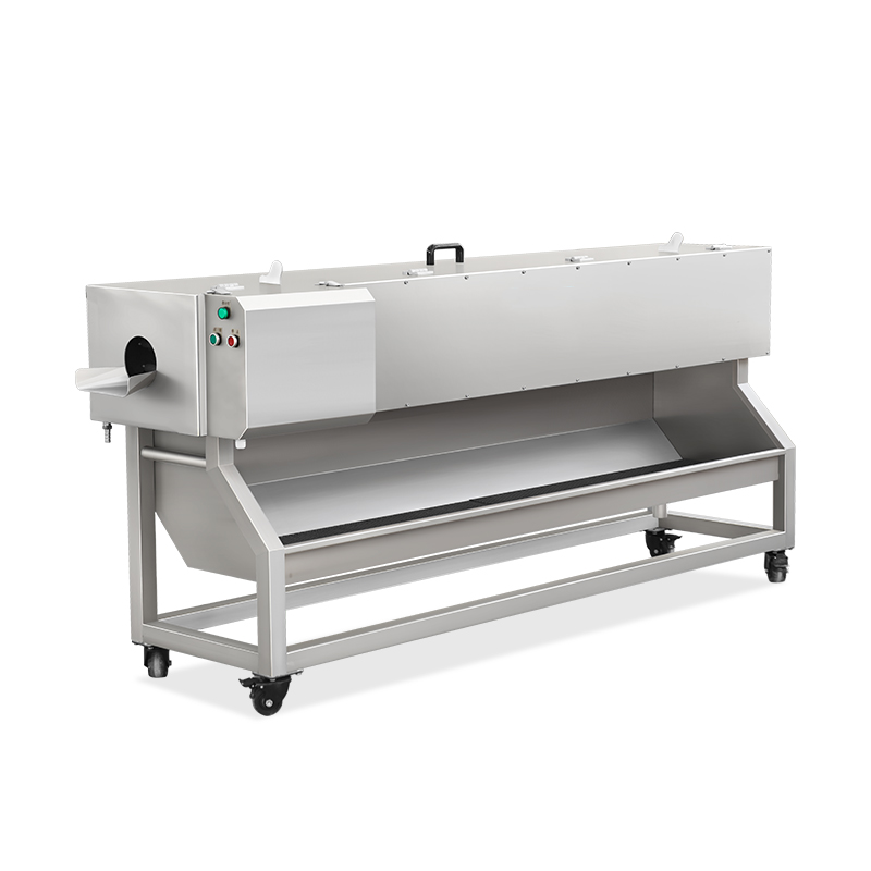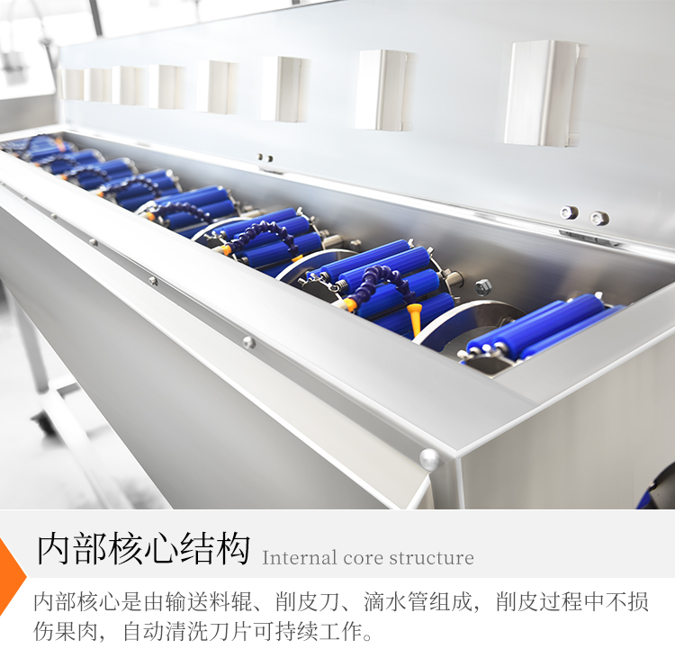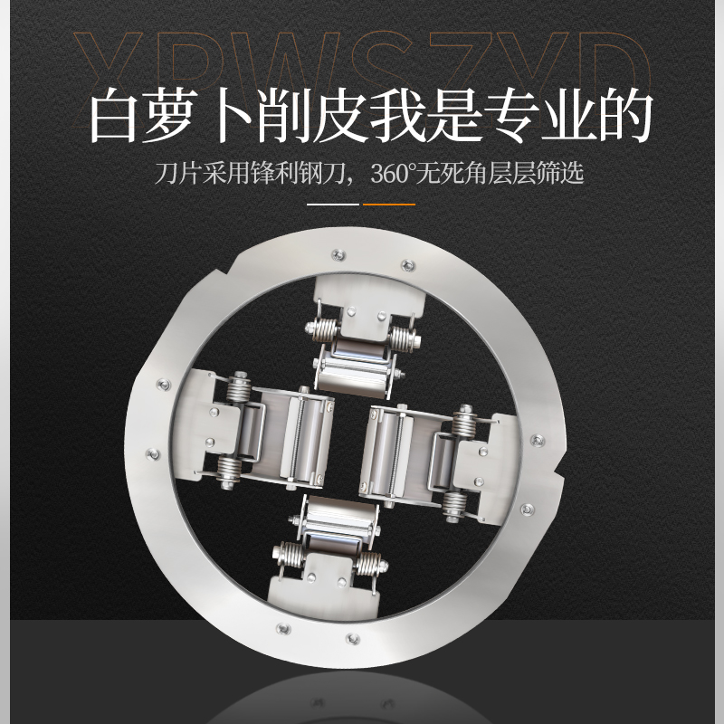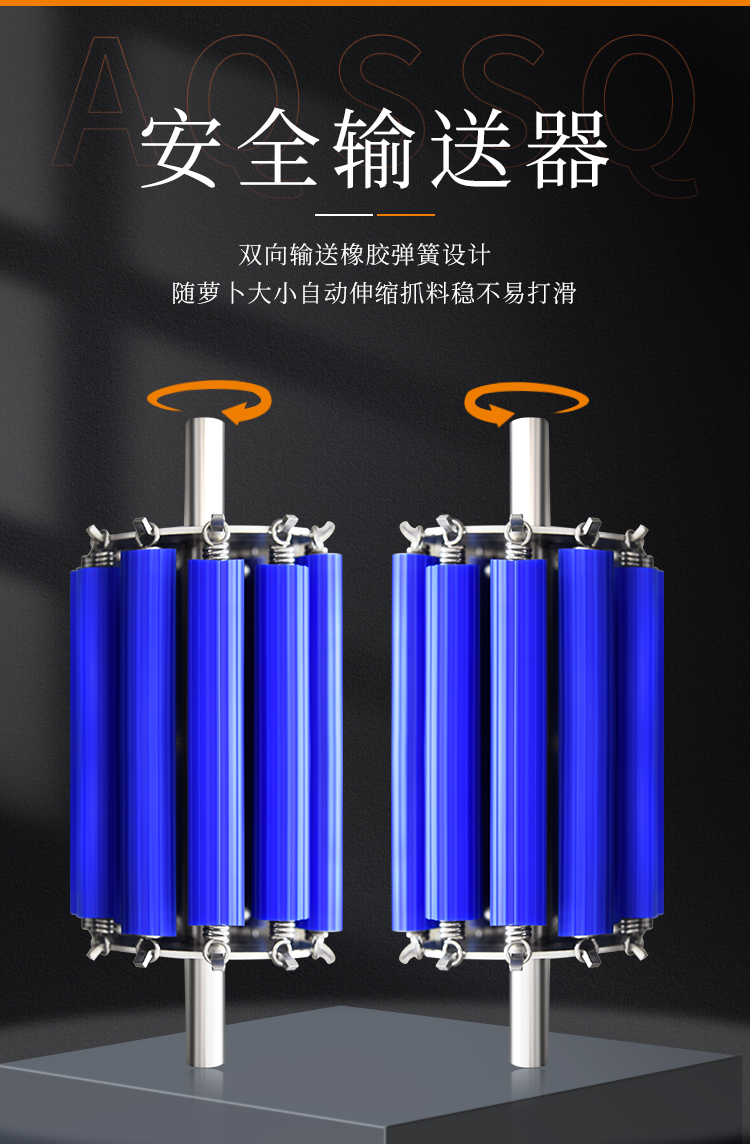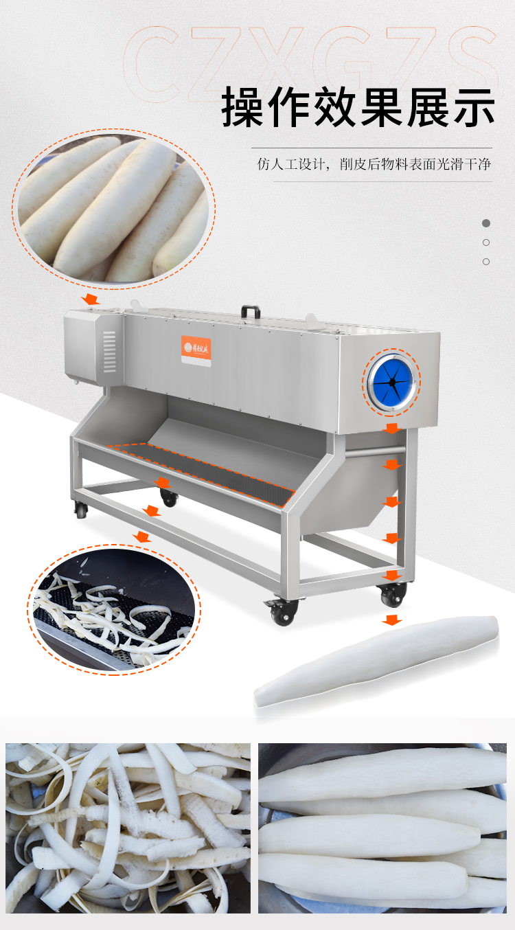 白蘿卜削皮機是贛云機械生產的一款實用型機器,針對于白蘿卜等長條型果蔬的自動去皮,多用于食品加工廠、快餐加工中心、商超、大型食堂等場所,機器使用雙向輸送橡膠彈簧設計,隨蘿卜大小自動伸縮抓料穩定不易打滑,一次性去皮,去皮成品率高,機器采用不銹鋼材質,注重食品衛生安全