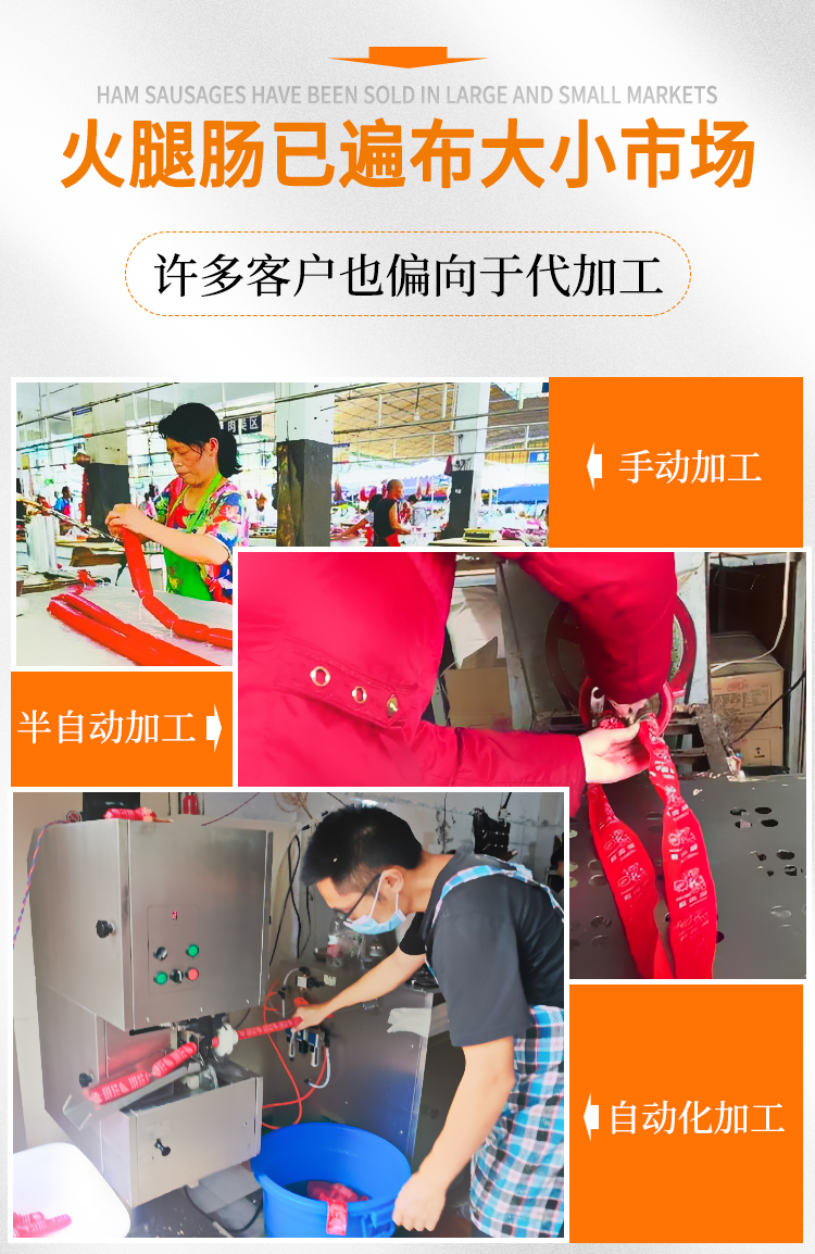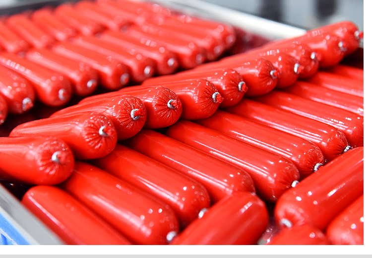 火腿腸原料的絞肉、打漿,火腿腸的灌腸打扣、蒸熟。