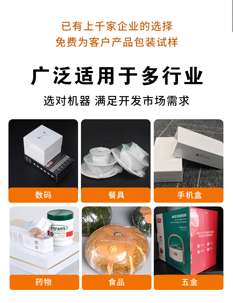 適用于數碼、餐具、手機盒、藥物、食品、五金材料等外包裝、塑封等。