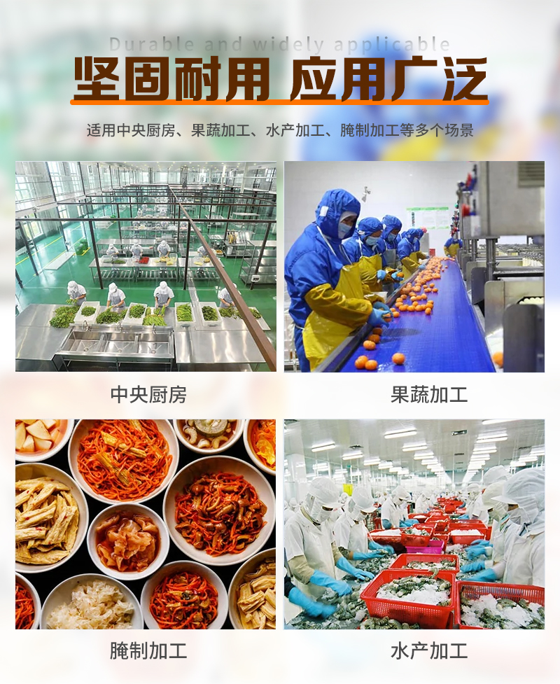 適用土豆、白菜、櫻桃、蘋果、蘿卜、魚、青菜、辣椒、香料、姜等水果蔬菜、水產品和其它各類食品的清洗。