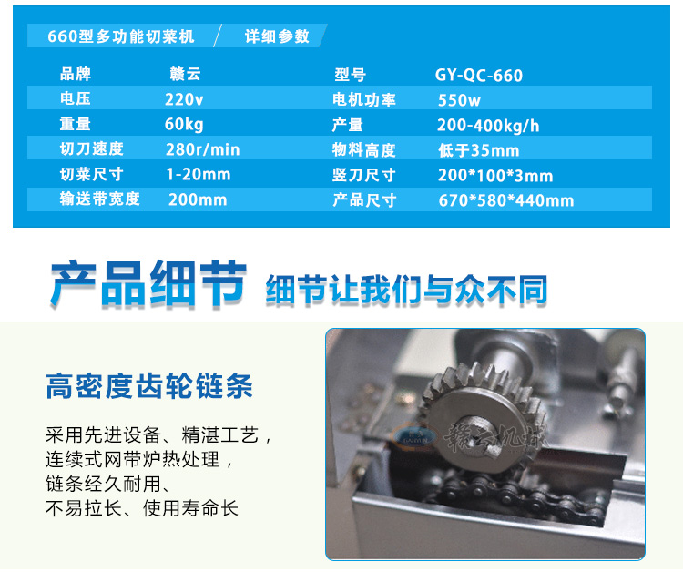 贛云牌多功能切菜機是根據多種樣機在實地使用中存在不足之處,反復改進設計制造,采用不銹鋼和全滾動軸承結構,具有外形美觀,成熟可靠,使用維修方便等特點。適用直蔬菜脫水、速凍、保鮮、腌漬等食品行業各類蔬菜。刀片距離可調節在0.1cm-2cm之間即切片、丁、絲厚薄在0.1cm-2cm。