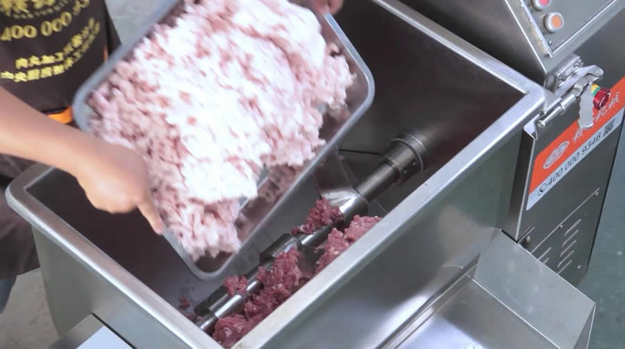 首先將所有原料準備好,原料有:鮮豬肉(比例為:瘦6肥4)、胡蘿卜、生姜、小蒜、馬蹄、淀粉、冰水等。第一步是需要將原料通過絞肉機絞碎,這一步是使用贛云42型不銹鋼絞肉機,這臺機器可以用于鮮肉、微凍肉類、蔬菜等絞碎,機器動力強勁,絞肉速度快,每小時可達600公斤。