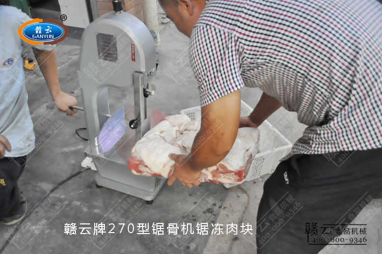 凍肉塊一般都是采用凍肉刨肉機加工處理刨成片狀,一般大型凍肉制品加工廠才會使用,但是小型的食品加工廠只是偶爾用到,今日贛云告訴你,凍肉塊也可以用贛云牌270型商用小型鋸骨機切割,而且切面整齊,機械占地面積小,不損傷肉類組織細胞,除了可以鋸凍肉,都凍骨頭、新鮮排骨、凍魚等切割效果也非常好。