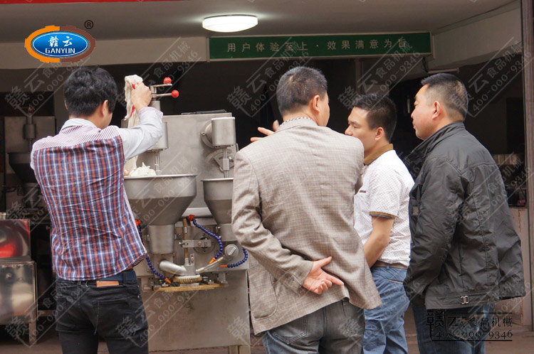小編在贛云有幸一睹了蟹黃魚丸的制作,包心蟹黃魚丸,來自江蘇省南通市如皋地區的顧先生自帶蟹黃魚丸用的魚漿、蟹黃,和膨化米片等材料,試機制作包心蟹黃魚丸,繁雜瑣碎的工藝在三代包心肉丸機的面前變得如魚得水。下面我們來看看這次試機實拍圖片: