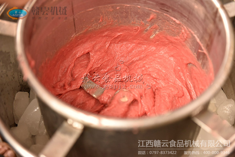 本次試機主要采用了32型強力絞肉機、28型高速肉丸打漿機和贛云第三代包心肉丸機,由于市場購買的是新鮮牛肉,所以原定計劃采用變頻慢速肉丸打漿機試機的臨時改為高速肉丸打漿機。