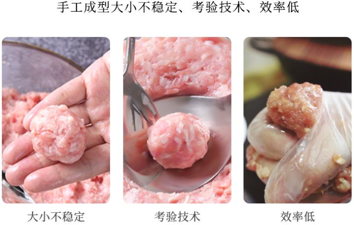 通過這種方法能夠保證肉丸的風味,但是其生產效率低下,而且不易保持一致的產品質量。手工制作肉丸還容易受到操作人員技術水平的影響,導致產品規格不一。