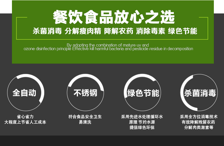 氣泡水循環臭氧洗菜機,殺菌消毒,強力清洗,節約80%以上用水,采用沖擊波原理,能自動將摘好的瓜果、蔬菜、肉類等食品表面清洗干凈,提高50%以上的工作效率,殺菌消毒采用紫外線和臭氧結合,有效殺滅有害細菌和分解農藥殘留。密集活氧發布點 360度情急無死角。