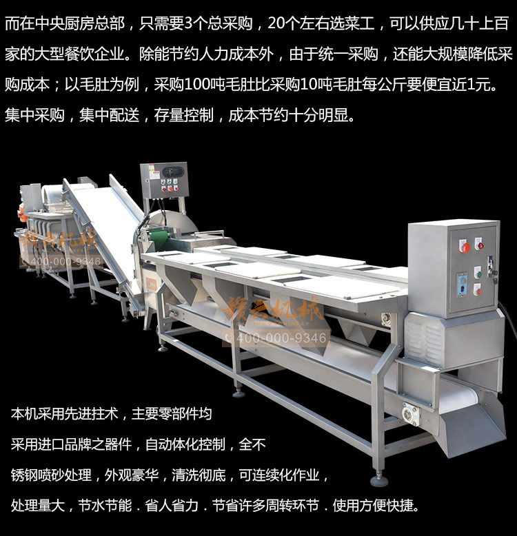 本套設備可用于中央廚房多元化分選、切割、清洗、過濾之用,主要適用于葉菜類凈菜加工切配,也適用于球根類蔬菜如白蘿卜、胡蘿卜等切片清洗,本套設備配有臭氧發生器,可用于清楚農藥殘留,清洗模式采用渦流沖壓式漩渦清洗,并帶有三層過濾裝置,渦流水槽內頂層排渣處理裝置,高頻振動篩雙層過濾。價格說明:配一臺提升機119980元/套,配兩臺提升機129860元/套。定制設備價格請與客服聯系